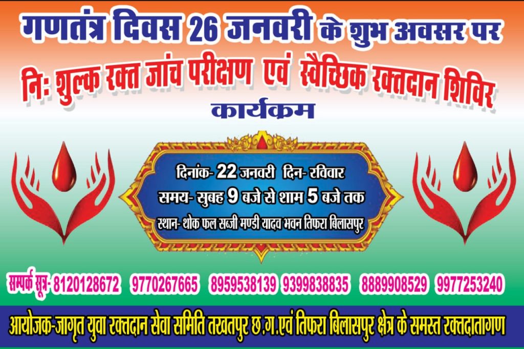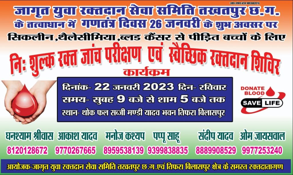 इसी कारण से हमारी समिति द्वारा रक्तदान के साथ-साथ रक्त जाँच परीक्षण आयोजित करने का निर्णय बैठक में सर्वसम्मति से लिया गया। श्रीवास ने आगे कहा कि सिकलीन,थैलेसीमिया, सिकलसेल, ब्लड कैंसर से पीड़ित बच्चों के लिए स्वैच्छिक रक्तदान एवं निःशुल्क रक्त जाँच शिविर दिनांक – 22 जनवरी 2023 दिन – रविवार समय – सुबह 9 से शाम 5 बजे तक थोक फल सब्जी मंडी रोड तिफरा बिलासपुर में किया जाएगा। समिति के उपाध्यक्ष आकाश यादव ने बताया कि शिविर से प्राप्त ब्लड थैलेसीमिया पीड़ित बच्चो को निःशुल्क दिया जाएगा। समिति के कोषाध्यक्ष संदीप यादव, सचिव मनोज कश्यप ने युवाओं से अपील करते हुए कहा कि जिन रक्तदाता का पिछला रक्तदान का 3 महीना का कंप्लीट हो गया है तो शिविर में पहुंच कर अवश्य रक्तदान करे। जो एक बार भी रक्तदान नहीं किए है उन सभी युवाओं से अपील करते हुए कहा कि आप बिल्कुल स्वस्थ हो तो अवश्य रक्तदान करे। आपका रक्त ब्लड बैंक मे जमा रहता है। कभी भी जरूरत पड़ने पर तत्काल जरूरतमंद लोगों को तत्परता के साथ निःशुल्क ब्लड उपलब्ध कराया जाएगा। अगर सही समय पर लोगों को ब्लड मिल जाता है तो उस इंसान की ज़िंदगी बच जाती है!और यदि उसे सही समय पर रक्त न मिले तो वो इंसान अपनी ज़िंदगी तक खो बैठता है। उस वक़्त इन चंद ब्लड की बूंदों की अहमियत का एहसास होता है कि चंद बूंदें ब्लड की किसी की ज़िंदगी भी बच सकती है