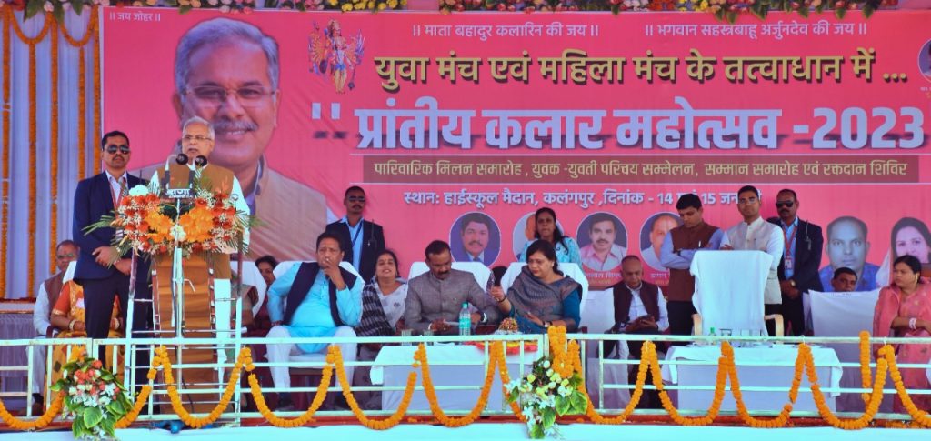 श्री बघेल आज गुण्डरदेही विकासखण्ड के ग्राम कलंगपुर में आयोजित प्रांतीय कलार महोत्सव 2023 समारोह को संबोधित कर रहे थे। इस अवसर पर उन्होंने कलार समाज सहित समूचे छत्तीसगढ़ के गौरव माता बहादुर कलारिन की वीरता को अनुपम एवं अद्वितीय बताया। श्री बघेल ने कहा कि माता बहादुर कलारिन की अदम्य वीरता पर हम सबको नाज है। श्री बघेल ने माता बहादुर कलारिन के नाम से वीरता पुरस्कार प्रदान करने की घोषणा भी की। इसके अलावा उन्होंने पूर्व माध्यमिक शाला ग्राम परसाही को हाई स्कूल मे उन्नयन, ग्राम सिकोसा में नवीन प्राथमिक स्वास्थ्य केंद्र की स्थापना, ग्राम कलंगपुर में सामुदायिक भवन के लिए 20 लाख रुपये, सीसी रोड निर्माण हेतु 10 लाख रुपए और सोलर हाई मास्क लाईट के लिए 10 लाख रुपए की घोषणा की। मुख्यमंत्री ने कहा की हमारी सरकार राज्य महुआ बोर्ड गठन हेतु निरंतर प्रयासरत है। इसके लिए मंत्रीमंडल में सहमति बनने का कार्य किया जा रहा है। उन्होंने राज्य महुआ बोर्डं का अध्यक्ष कलार समाज के व्यक्ति को बनाने की भी जानकारी दी। कार्यक्रम की अध्यक्षता राज्य पिछड़ा वर्ग आयोग की सदस्य एवं कलार समाज के महिला मंच के प्रांताध्यक्ष किरण सिन्हा ने किया।