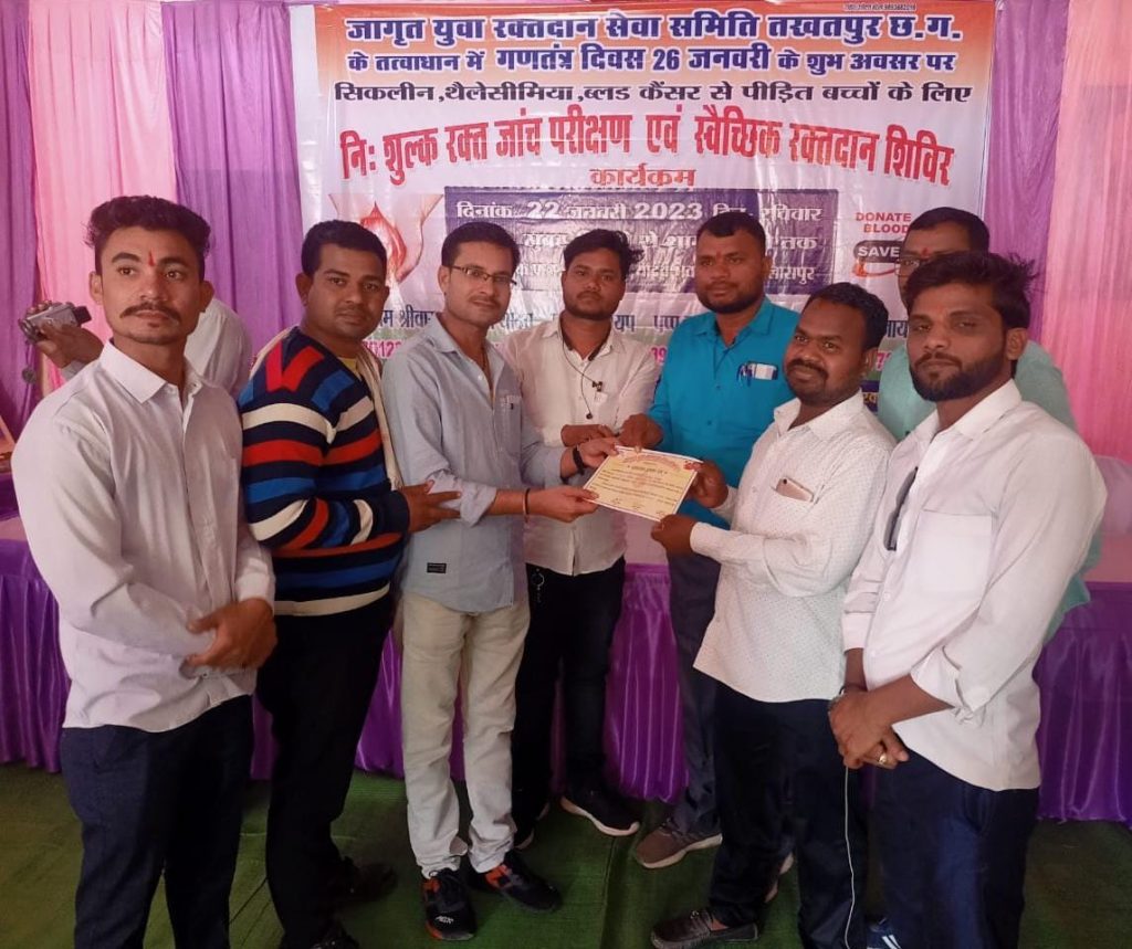 बालोद/ बिलासपुर। जागृत युवा रक्तदान सेवा समिति तखतपुर छग के तत्वाधान में थोक फल सब्जी मंडी तिफरा बिलासपुर में विशाल रक्तदान शिविर का आयोजन किया गया