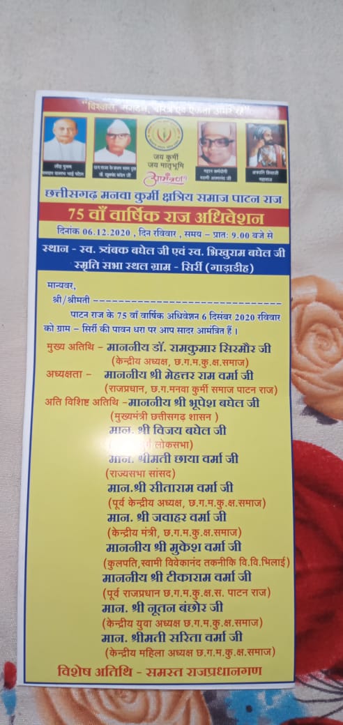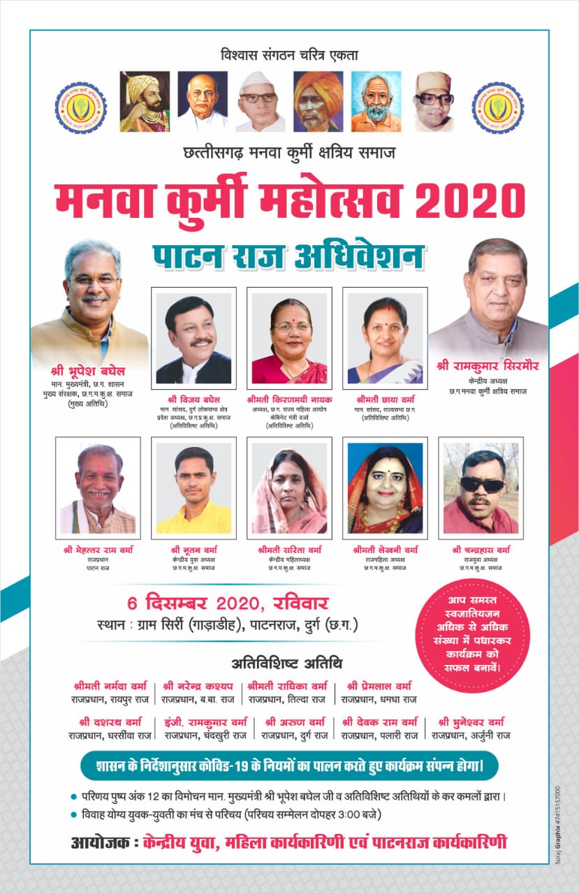 रायपुर/ बालोद। आज बालोद जिले के गुंडरदेही ब्लाक के ग्राम सिर्री में मुख्यमंत्री भूपेश बघेल का आगमन हो रहा है। वे वहां छत्तीसगढ़ मनवा कुर्मी क्षत्रिय समाज के 75 वें वार्षिक अधिवेशन में अति विशिष्ट अतिथि के रूप में शामिल होंगे। मुख्य अतिथि समाज के केंद्रीय अध्यक्ष राज कुमार सिरमौर होंगे। सीएम का प्रोटोकॉल जारी होने के बाद जिला प्रशासन भी अपनी तैयारी में जुटा हुआ है। हेलीपैड बन चुका है। वहीं सामाजिक स्तर पर सारी तैयारी चल रही है। यहां आज छत्तीसगढ़ मनवा कुर्मी क्षत्रिय समाज केंद्रीय युवा/महिला संगठन की वार्षिक मनवा कुर्मी महोत्सव एवं पाटन राज अधिवेशन का भव्य आयोजन किया गया है। इसकी जानकारी देते हुए छत्तीसगढ़ मनवा कुर्मी क्षत्रिय युवा समाज के केन्द्रीय अध्यक्ष नूतन कुमार बंछोर एवं मीडिया प्रभारी घनश्याम वर्मा ने बताया कि परिणय पुष्प पत्रिका विमोचन मुख्यमंत्री भूपेश बघेल (मुख्य संरक्षक) व अति विशिष्ट अतिथियों के करकमलों से होगा। वैश्विक महामारी कोविड 19 को देखते हुए कार्यक्रम शासन के नियमों के परिपालन में दोपहर एक बजे से शाम 4 बजे तक सम्पन्न होगा।