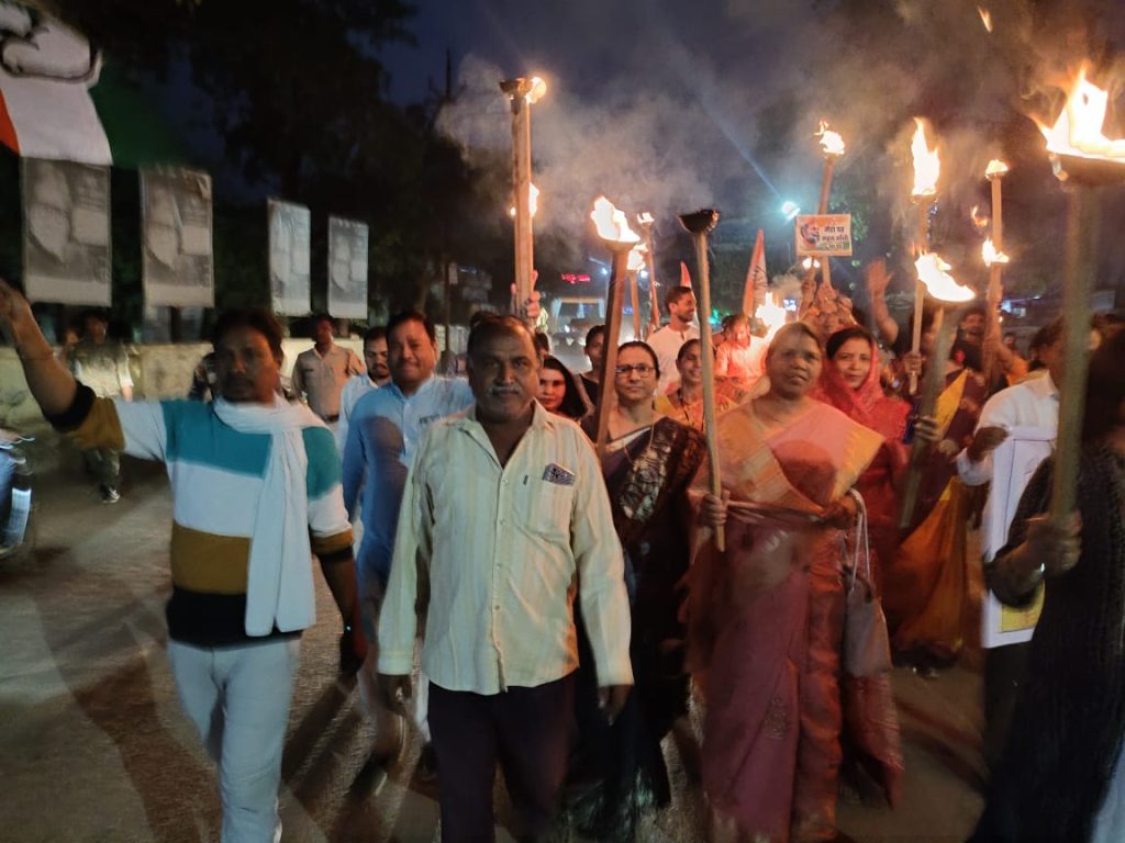 जो कांग्रेस भवन से होकर नगर भ्रमण कर वापस जय स्तंभ चौक पहुंची। इस दौरान केंद्र की सरकार के खिलाफ कांग्रेस कार्यकर्ताओं ने जमकर नारेबाजी की। विधायक संगीता सिन्हा ने इस दौरान केंद्र सरकार पर जमकर निशाना साधा उन्होंने कहा कि “राहुल गांधी जी को आज जो सजा मिल रही है, वह उनके केवल 2 सवालों के कारण हैं. उन्होंने क्या गलत पूछा. जनता के हित में, देश के हित में बस 2 सवाल पूछे. तो, प्रधानमंत्री जी को इतनी मिर्ची लग गई कि इस तरह का घटनाक्रम कराया गया.। जिला कांग्रेस कमेटी के अध्यक्ष चंद्रप्रभा सुधाकर ने कहा कि “हम शांतिपूर्ण ढंग से आज न्याय मांगने निकले हैं. पूरे देश में मशाल रैली निकाली जा रही है। राहुल गांधी के समर्थन में पूरा देश खड़ा है। संसद में बोलने का अधिकार सबको होता है। अगर आप सही हो, तो आपको सामना करना चाहिए। परंतु यहां की केंद्र में बैठी नरेंद्र मोदी की नेतृत्व वाली सरकार ने सवालों का सामना नहीं किया, बल्कि सवाल खड़े करने वालों को ही बाहर करने का कृत्य किया है। मशाल रैली में विकास चोपड़ा, अनिल यादव, साजन पटेल, विनोद टावरी सहित बड़ी संख्या में कांग्रेसी शामिल हुए।