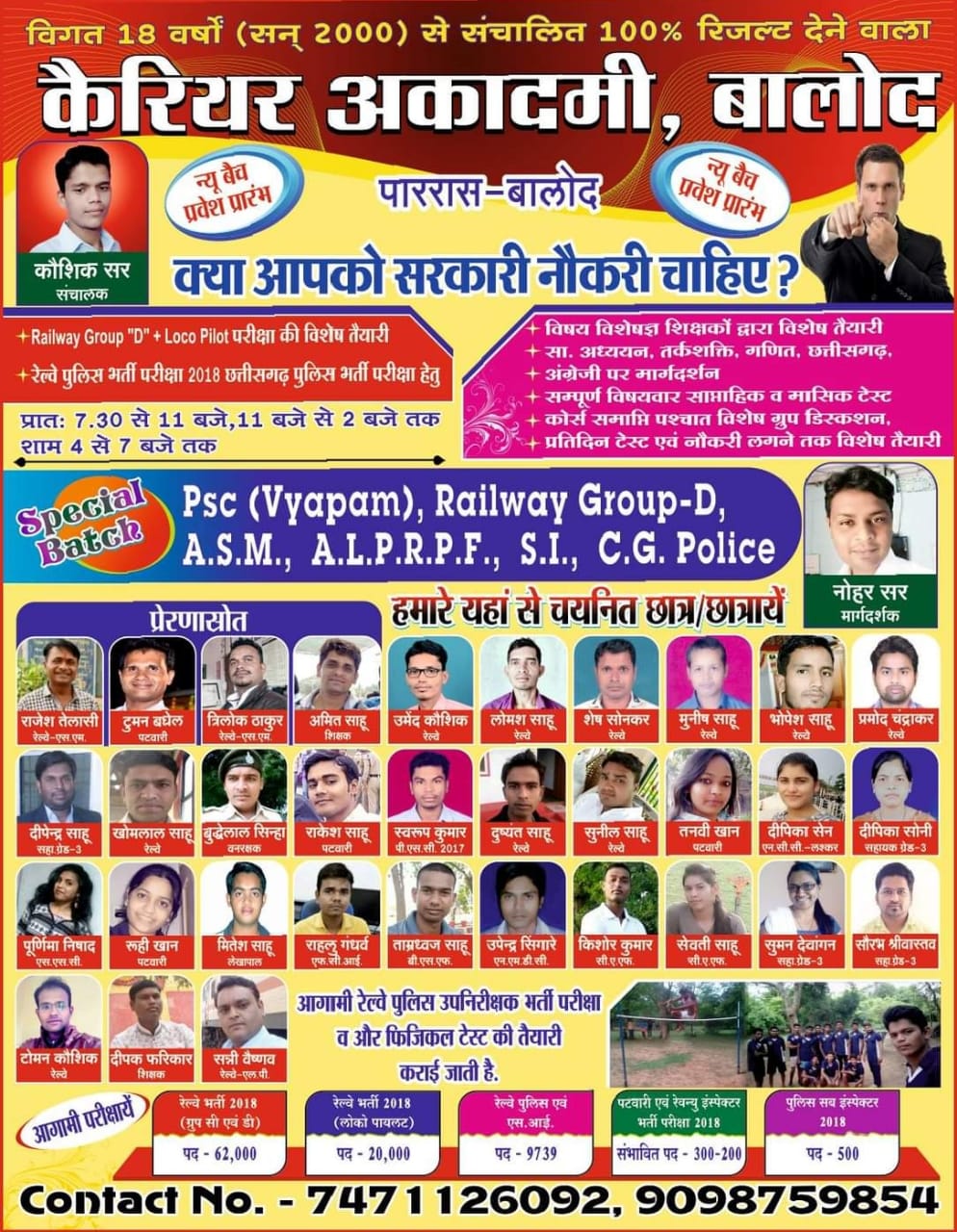 बालोद। पाररास में संचालित कैरियर अकादमी विगत 18 वर्षों से खासतौर से युवाओं के लिए प्रेरणा स्रोत बनी हुई है। यहां के संचालक गोपेंद्र कौशिक व उनके साथियों द्वारा युवाओं को पुलिस व विभिन्न भर्ती के लिए निशुल्क ट्रेनिंग दी जाती है। विगत 20 साल से जिले में एकमात्र प्रतियोगी परीक्षा की तैयारी करवाने वाली यह संस्था है। जहां अभी तक विभिन्न विभागों में 1000 से ज्यादा लोगों का चयन हो चुका है।वर्तमान में इस संस्था के माध्यम से जुंगेरा के मैदान में युवाओं को निशुल्क पुलिस भर्ती की ट्रेनिंग दी जा रही है।