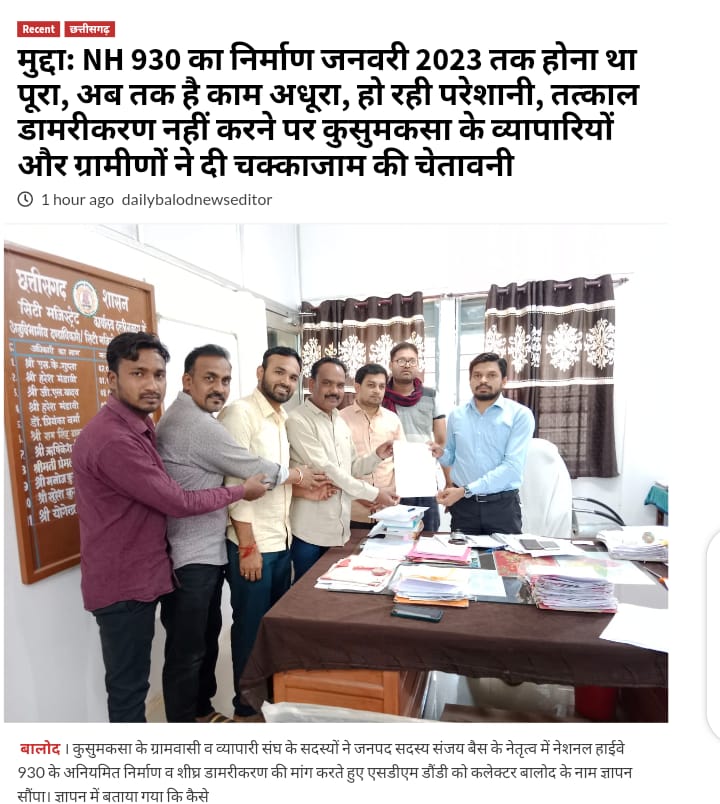 बता दें कि आज ही कुसुमकसा के ग्रामवासी व व्यापारी संघ के सदस्यों ने जनपद सदस्य संजय बैस के नेतृत्व में नेशनल हाईवे 930 के अनियमित निर्माण व शीघ्र डामरीकरण की मांग करते हुए एसडीएम डौंडी को कलेक्टर बालोद के नाम ज्ञापन सौंपा था। ज्ञापन में बताया गया कि कैसे प्रमुख रूप से मार्ग में उड़ती हुई धूल व ठेकेदार की मनमानी से सभी ग्रामवासी व रोड किनारे व्यवसाय करने वाले दुकानदार व्यापार व स्वास्थ्य समस्यों से जूझ रहे है। कोरोना के पुनः वापसी व धूल के कणों से सर्दी खांसी व संक्रमण के मरीज़ बढ़ रहे है।