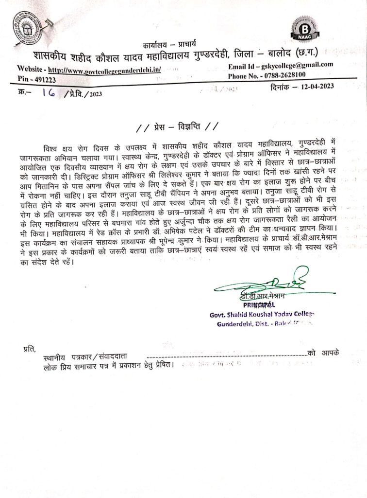 गुंडरदेही। विश्व क्षय रोग दिवस के उपलक्ष्य में शासकीय शहीद कौशल यादव महाविद्यालय, गुण्डरदेही में जागरूकता अभियान चलाया गया।
