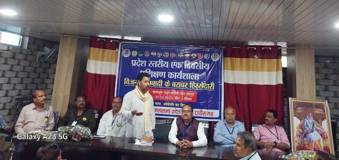 प्रशिक्षण कार्यशाला में ओबीसी महासभा के प्रदेश, संभाग के पदाधिकारी एवं जिलाध्यक्ष उपस्थित रहे साथ ही सभी जिलों के लिए मास्टर ट्रेनर्स तैयार करने हेतु अधिकांश जिला के 5-5 प्रतिभागी ने भाग लिया, जो अपने जिले में जाकर विकासखंड से लेकर अंतिम इकाई गांव/ मोहल्ला तक प्रशिक्षक तैयार करेंगे ।कार्यक्रम का सफल संचालन कोरिया जिलाध्यक्ष राजेशकुमार साहू ने किया। उक्त कार्यशाला को प्रशिक्षक द्वय एडवोकेट महेंद्र वर्मा प्रदेश महासचिव एवं श्री दिलीप कुमार साहू ने प्रशिक्षण मॉड्यूल के अनुसार प्रभावी ढंग से प्रस्तुत किया ।सभी प्रतिभागियों को बैज, परिचय पत्र ,प्रशिक्षण मॉड्यूल एवं ओबीसी ध्वज प्रदान किया गया प्रशिक्षकों द्वारा प्रमुख रूप से प्रशिक्षण की आवश्यकता ,प्रशिक्षण के उद्देश्य, प्रशिक्षणार्थी की योग्यता, प्रशिक्षित लोगों की भूमिका ,प्रशिक्षित कार्यकर्ता के गुण, ओबीसी की सामाजिक समस्या ,कारण एवं निदान ,भारतीय सामाजिक व्यवस्था का संवैधानिक रूप ,ओबीसी के लिए मुक्ति का प्रयास, ओबीसी समाज को जगाने वाली शक्तियां, संवैधानिक अधिकार, समाज के लिए आशा की नई किरण ओबीसी महासभा आदि की विस्तृत जानकारी दिया गया । प्रदेश अध्यक्ष ने बताया कि 14 मई 2023 को जिला सारंगढ़ बिलाईगढ़ में ओबीसी महासभा का जिला स्तरीय सम्मेलन आयोजित है ।माह जून में बिलासपुर रायगढ़ जिला के तमनार तथा बस्तर में बड़ा सम्मेलन की तैयारी है। प्रशिक्षण में प्रमुख रूप से प्रदेश महासचिव ओबीसी युगल किशोर, जनक राम साहू, किरण देवांगन, प्रदेश उपाध्यक्ष महेश गौरव ,प्रदेश सचिव कृष्णा प्रजापति ,प्रदेश कोषाध्यक्ष महावीर कलिहारी ,प्रदेश प्रवक्ता अनिल देवांगन ,प्रदेश अध्यक्ष युवा मोर्चा चंदू देवांगन, प्रदेश अध्यक्ष अधिकारी मोर्चा रामजी सिंह, प्रदेश अध्यक्ष विधि मोर्चा पुनाराम साहू, प्रदेश उपाध्यक्ष महिला मोर्चा खिलेश्वरी साहू ,संभाग अध्यक्ष बस्तर, दुर्ग बिलासपुर, रायपुर क्रमशः दिनेश यदु विप्लव साहू ,हरीश कुमार, हेमंत कुमार, संभाग उपाध्यक्ष बिलासपुर चैतुराम साहू, बस्तर तुलसीराम ठाकुर, संभाग सचिव बस्तर अमित कुमार साहू, संभाग महासचिव दुर्ग महेंद्र साहू, संभाग अध्यक्ष बिलासपुर महिला मोर्चा प्रेमलता बैरागी एवं उपाध्यक्ष अनुसुईया निषाद ,सरगुजा संभाग अध्यक्ष महिला मोर्चा सावित्री मारिया दास, जिलाध्यक्ष कोरबा नकुल रजवाड़े, रायगढ़ जिलाध्यक्ष नंदलाल चंद्रा ,सारंगढ़ जिलाध्यक्ष शनीराम साहू, महासमुंद परसूराम नायक,राजनंदगांव जिलाध्यक्ष खिलेश्वर पाल, गरियाबंद जिलाध्यक्ष फलेंद्र साहू ,कोरिया जिलाध्यक्ष राजेश साहू ,अंबागढ़ चौकी मानपुर मोहला जिलाध्यक्ष जितेंद्र पटेल ,बस्तर जिलाध्यक्ष मुन्ना लाल यादव ,जांजगीर चांपा जिलाध्यक्ष 
