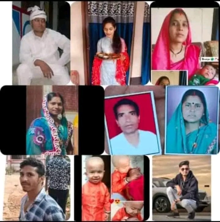बोलेरो वाहन चला रहे मेरा बड़ा भाई केशव साहू पिता धरमराज साहू उम्र 34 साल एवं वाहन में सवार कन्डेक्टर सीट में बैठे डामेश ध्रुव पिता विदेशी राम ध्रुव उम्र 19 साल ,ड्रायवर सीट के पीछे बैठे मेरी भाभी टोमीन साहू पति केशव साहू उम्र 33 साल, बगल में बैठे मेरी पत्नि संध्या साहू पति राहूल साहू उम्र 24 साल, मेरी पत्नि के बगल में बैठे मेरी बहन रमा साहू पिता स्व0 अर्जुन साहू उम्र 20 साल, कन्डेक्टर साईड के पीछे बैठे मेरा चाचा का लड़का (भाई) शेलेन्द्र साहू पिता स्व0 अर्जुन साहू उम्र 22 साल, मेरी चाची लक्ष्मी साहू पति स्व0 अर्जुन साहू उम्र 45 साल, वाहन के पीछे सीट में बैठे मेरे पिता धरमराज साहू पिता स्व0 मनबोध साहू उम्र 55 साल मेरी मां उषा साहू पति धरमराज साहू उम्र 52 साल, मेरे बड़ा पुत्र योग्यांश साहू पिता राहुल साहू उम्र 03 साल सभी साकिनान सोरम थाना रूद्री जिला धमतरी को सिर एवं शरीर में गंभीर चोट लगने से मौके पर ही मौत हो गये एवं छोटा लड़का ईशांत साहू उम्र डेढ़ साल को गंभीर चोट लगने से घायल होने से 108 वाहन के द्वारा ईलाज हेतु ले जा रहा था कि रास्ते मे उसकी भी मृत्यु हो गई।