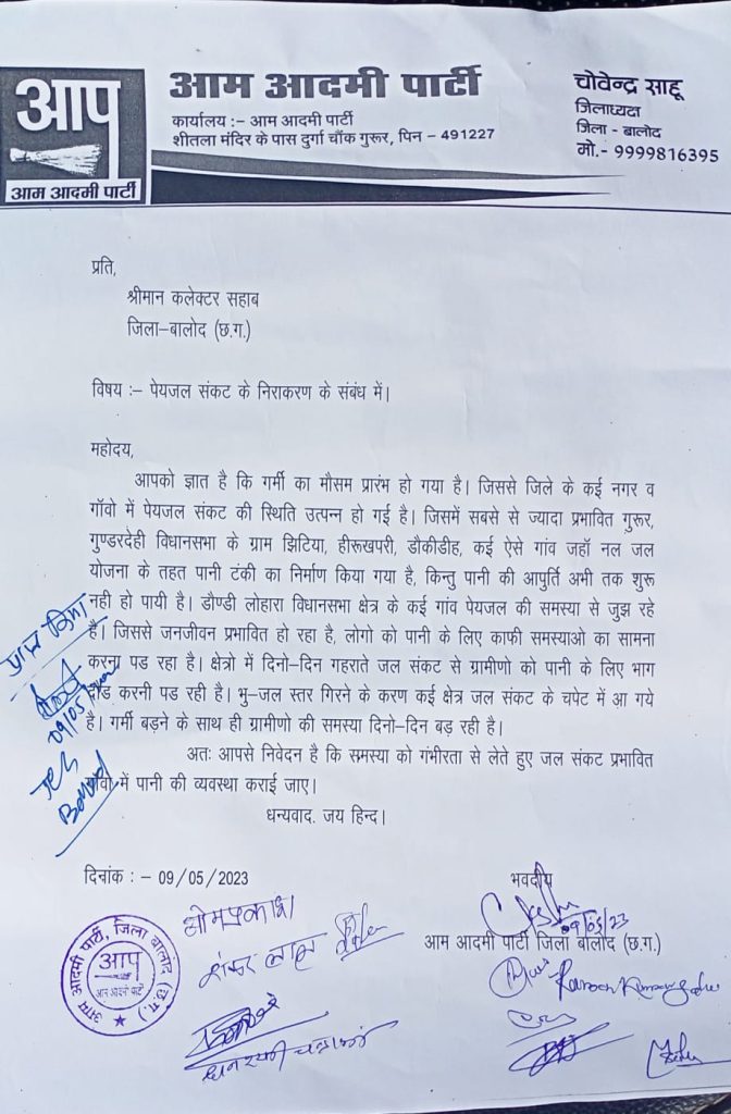 ‘आप’ नेता विनय गुप्ता (जिला सचिव आप) ने कहा कि गर्मी शुरू होते ही दूषित पानी की समस्या भी खड़ी हो गई है। ग्रामीण कई किलोमीटर दूर से पानी लाने को मजबूर है। ग्रामीणों को शुद्ध पेयजल के लिए बहुत भटकना पड़ रहा है। राज्य में जल जीवन मिशन के तहत गांव-गांव तक नल से जल देने के लिए सरकार काम कर रही है। बावजूद इसके पानी की समस्या बनी हुई है। ग्रामीणों को पानी के लिये दौड़-भाग करनी पड़ रही है। भूजल स्तर गिरने के कारण कई इलाके में जल संकट की चपेट में आ गए है। आम आदमी पार्टी इस समस्या को गंभीरता से लेते हुए सरकार से जल संकट प्रभावित गांवों में पानी की व्यवस्था कराने की मांग की है।