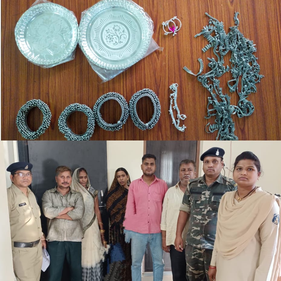 बालोद। क्षेत्र में बढ़ रहे चोरी, आपराधिक तत्व के व्यक्ति के निगरानी रखने, सोने चांदी सफाई, सराफा बाजार में चेक करने हेतु पुलिस पुलिस महानिरीक्षक दुर्ग रेंज आनन्द छाबड़ा के निर्देशन पर पुलिस अधीक्षक बालोद जितेन्द्र कुमार यादव के मार्गदर्शन में, अतिरिक्त पुलिस अधीक्षक बालोद हरीश राठौर एवं पुलिस अनुविभागीय अधिकारी बालोद प्रतीक चतुर्वेदी एवं समस्त थाना प्रभारी को प्रतिदिन अपने क्षेत्र में सतत् पेट्रोलिंग करने हेतु निर्देशित किया गया था। इसी क्रम में घटना दिनांक 15.05.2023 कि करीबन 11:30 बजे प्रार्थी प्रवीण तीनखेड़े के हलधर चौक स्थित गंगा मैया ज्वेलर्स दुकान में 04 आदमी एवं 02 औरत आये जिनमें से एक औरत अपने साथ 03-04 साल का बच्चा रखा था, उनमें से एक आदमी अपना नाम रामजी पिता छोटलाल निवासी हीरापुर का रहने वाला बताकर बोला कि मेरी दो बहन को गिफ्ट देना है उसके लिए कोई चांदी का सामान दिखाओं कहने पर 02 थाली जिसका वजन 25,775 को प्रार्थी द्वारा उन लोगो को एक जोड़ी पुराना पायजेब कीमती 30,135 रू. के बदले में दिया, तथा बचत रकम 4360 रु नगद दिया उसी दिन शाम करीबन 06:00 बजे चांदी के पुराने पाजेब को थाना अर्जुन्दा पुलिस के माध्यम से थाना बालोद को उक्त सोने चांदी की दुकान जाकर बेचे गये समान को चेक करने हेतु भेजने पर चेक करने से वह नकली निकला। इस तरह उक्त व्यक्तियों द्वारा दुकान में आकर नकली चांदी का पाजेब बेचकर प्रार्थी के साथ धोखाधड़ी किया गया। प्रार्थी के रिपोर्ट पर थाना बालोद में अपराध क्रमांक 227/2023 धारा 420, 34 भादवि का अपराध कायम कर अरोपियों रामजी, बाबूलाल, दाता सोनी, राजकुमारी, कंचन से कड़ाई से पुछताछ करने पर बताये कि सभी आरोपिया के द्वारा एक ही परिवार के सदस्य है उनके द्वारा एक राय होकर नकली चांदी का जेवर बेचकर ठगी करना बताये है।