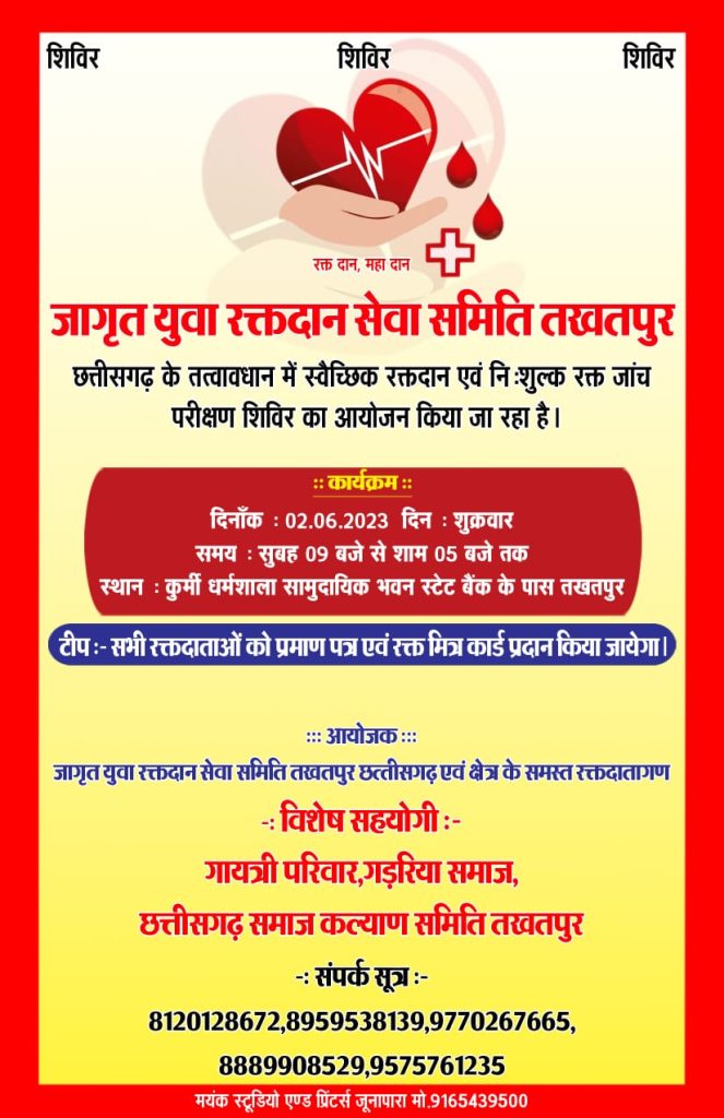 यह कार्यक्रम 2जून 2023 दिन शुक्रवार सुबह 9 बजे से शाम 5 बजे तक स्थान कुर्मी धर्मशाला स्टेट बैंक के पास तखतपुर में रखा गया है। सभी रक्तदाताओं को प्रमाण पत्र एवं उपहार स्वरूप हेल्मेट प्रदान किया जाएगा। रक्तदान सेवा समिति के संस्थापक घनश्याम श्रीवास एवं सचिव मनोज कश्यप ने क्षेत्र के सभी युवा, युवतियाँ को रक्तदान करने के लिए अपील किया है।रक्तदान करने के लिए आगे आए आपके एक रक्तदान 4 लोगों की जिंदगी बचेगा। जिस तरह से आए दिन सड़क दुर्घटना में गंभीर रूप से घायल के साथ ही लोगों की मौत हो रहीं हैं उसी को मद्देनजर रखते हुए सभी आज कल के युवा पीढ़ी को हेल्मेट देकर यातायात के नियमों के साथ साथ यातायात जागरूकता की मुहिम शुरू करने का निर्णय लिया गया है।सामाजिक कार्यकर्ता नारायण पाली ने अपने समाज के साथ साथ क्षेत्र के सभी स्वस्थ युवाओं से अपील करते हुए कहा कि अधिक से अधिक संख्या में रक्तदान कर जरूरतमंद लोगों तक पहुंचाने में सहयोग करे। थैलेसीमिया, सिकलसेल, कैंसर जैसे बीमारी से पीड़ितों के लिए प्रतिदिन रक्त की जरूरत अधिक होती है जिसकी पूर्ति करने एवं पीड़ितों को जीवनदान देने के लिए सभी युवा पीढ़ी आगे आएं। भीषण गर्मी में वर्तमान समय में सभी ब्लड बैंक में ब्लड की कमी हो रही है और ब्लड का डिमांड प्रतिदिन बढती जा रही है।