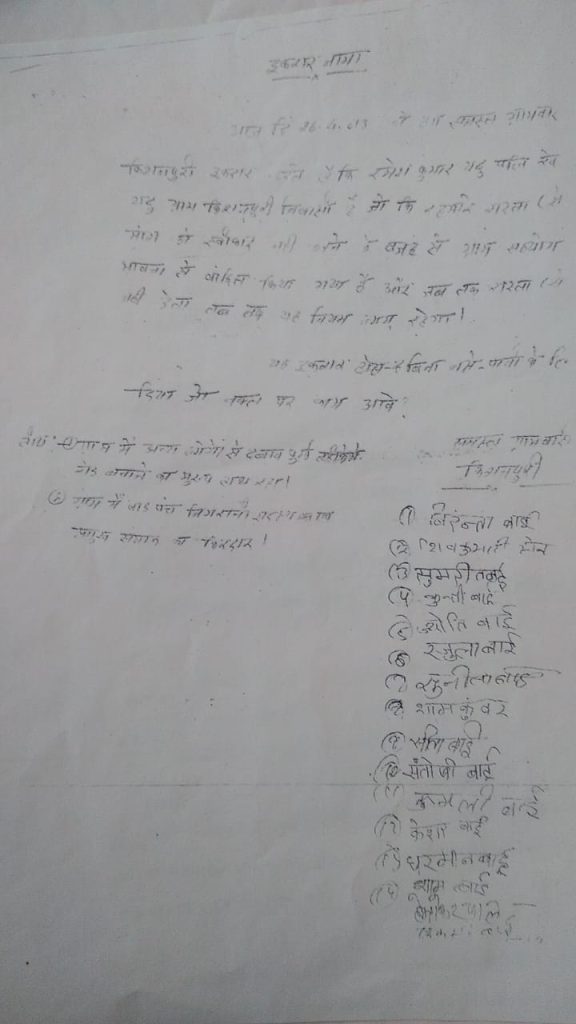 बुधवार को रेवती बाई पिता बृजलाल, जाति ठेठवार, निवासी किशनपुरी, तहसील- डौण्डी, जिला बालोद ने मामले की लिखित शिकायत थाने में की जिसमें उन्होंने बताया है कि मेरे नाम पर ग्राम किशनपुरी में भूमि नं0 221 रकबा 1.51 है, भूमि राजस्व अभिलेख में दर्ज है। उक्त भूमि पर ग्राम पंचायत मथेना आश्रित ग्राम किशनपुरी के निवासी द्वारा मुझे दिनांक 25 अप्रैल 2013 से गांव से बहिस्कृत कर मेरी भूमि के बीचो बीच कच्ची सड़क निर्माण किया गया है। तथा दिनांक 06 जून 2023 को शाम के समय सरपंच जगनु राम भेड़िया एवं अन्य ग्रामवासीयों द्वारा पुनः जे.सी.बी क्रमांक. CG 19BM6340 के माध्यम से मिट्टी व पुल डाला गया है। खेत में मिट्टी डालने पर मुझे खेती कार्य करने में परेशानियों का सामना करना पड़ रहा है। एवं सरपंच व ग्रामवासियों द्वारा गांव से बहिस्कृत कर मानसिक प्रताड़ना करता है और खेत जाने-आने के लिए मना एवं गाली गलौच करते है। जिससे मैं अत्यधिक मानसिक रूप से परेशान हूँ । अतः मेरे भूमिस्वामी हक की भूमि से मिट्टी व पुल को तत्काल हटाने की आदेश देने की कृपा करे एवं प्रताड़ित करने वाले सरपंच व ग्रामवासियों के विरुद्ध उचित कार्यवाही की जाए।