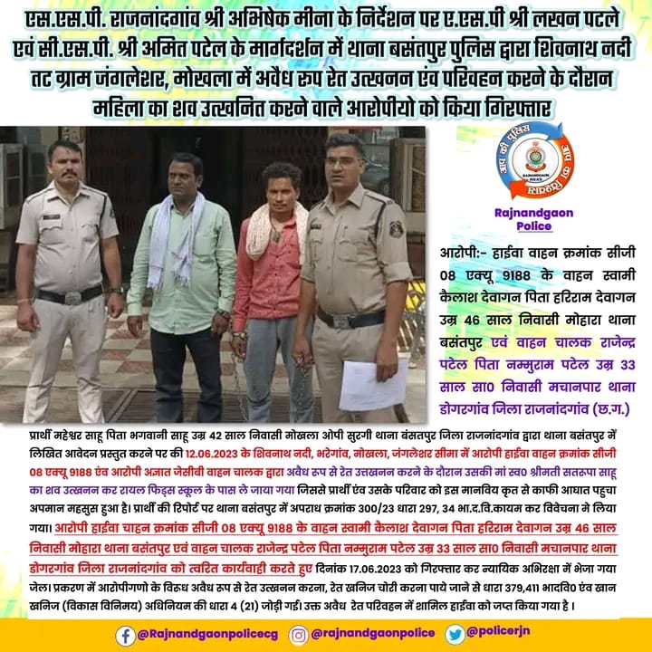 राजनांदगांव। एस.एस.पी. राजनांदगांव श्री अभिषेक मीना के निर्देशन पर ए.एस.पी श्री लखन पटले एवं सी.एस.पी. श्री अमित पटेल के मार्गदर्शन में थाना बसंतपुर पुलिस द्वारा शिवनाथ नदी तट ग्राम जंगलेशर, मोखला में अवैध रूप रेत उत्खनन एंव परिवहन करने के दौरान महिला का शव उत्खनित करने वाले आरोपीयो को किया गिरफ्तार।