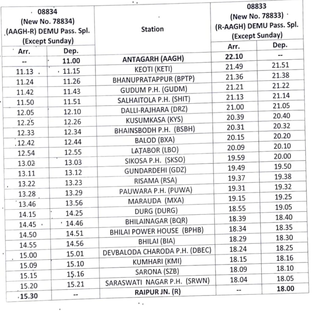 78818 अंतागढ़-रायपुर डेमू एवं 78833 रायपुर-अंतागढ़ डेमू की नियमित समय सारणी:-