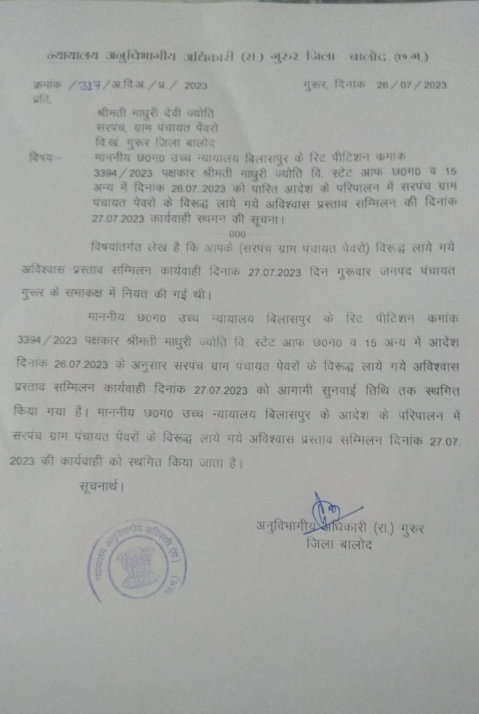 जिला अध्यक्ष पोषण देवांगन ने कहा सरपंच संघ के संगठन का परिणाम है कि माधुरी ज्योति सरपंच ग्राम पंचायत पेवरो, जनपद पंचायत गुरुर, के लिए ग्राम समिति के अध्यक्ष एवं संरक्षक के भयभीति कृत्य के कारण पंचगन द्वारा 27 जुलाई को अविश्वास प्रस्ताव सम्मेलन को न्यायालय हाई कोर्ट द्वारा स्टे हो गया है। लेकिन ग्राम समिति के अध्यक्ष और वहां के संरक्षक द्वारा जो अविश्वास प्रस्ताव लाने का भयभीत कृत्य था और सरपंच को प्रताड़ित किया जा रहा था तथा ग्राम सभा प्रस्ताव एवं ग्राम पंचायत प्रस्ताव के कार्यवाही पर आपत्ती करने के आरोप में कलेक्टर एवं एसपी के पास जिला सरपंच संघ के द्वारा शिकायत किया गया था जिसका जांच और साक्ष्य दिनांक 26 जुलाई को थाना गुरुर एवं एसडीएम कार्यालय गुरुर में लगातार दोनों जगह बयान कथन कार्यवाही अलग-अलग हुआ है। जहां पोषण लाल देवांगन जिला अध्यक्ष सरपंच संघ बालोद ,सचिव मनीष गांधीजी ,मीडिया प्रभारी दानेश्वर सिन्हा जी ,बालोद ब्लॉक अध्यक्ष अरुण साहू , खिलावन साहू ,दिनेश सिन्हा, गिरीश निर्मलकर, जया साहू आदि सरपंच संघ के पदाधिकारी गुरुर के थाना एवं एसडीएम कार्यालय में माधुरी ज्योति , को न्याय दिलाने के लिए डटे रहे और उधर जिला सरपंच संघ के उपाध्यक्ष चूकेश्वर साहू , माधुरी ज्योति के सरपंच पद बचाने हेतु हाई कोर्ट न्यायालयीन प्रक्रिया में प्रयासरत थे। लेकिन शिकायत की अब तक उचित आदेश पारित नहीं हुआ है ना ही आरोपी के विरुद्ध अपराध पंजीबद्ध किया गया है। सरपंच संघ द्वारा आपस में सुलह कराने का प्रयास भी किया जा रहा है। नहीं तो जिला सरपंच संघ द्वारा आरोपी के विरुद्ध कार्यवाही की मांग किया जाएगा।