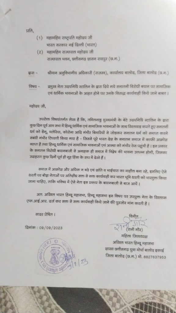 राष्ट्रपति, राज्यपाल के नाम से अनुविभागीय अधिकारी (राजस्व), कार्यालय बालोद को दिए ज्ञापन में कहा गया कि नेता उदयनिधि स्टालिन के द्वारा दिये गये सनातनी विरोधी बयान पर सामाजिक एवं धार्मिक भावनाओं के आहत होने पर उनके विरुद्ध कार्यवाही की जाए । रानी मनोज गौर महिला जिलाध्यक्ष अखिल भारत हिन्दू महासभा शाखा छत्तीसगढ़ युवा मोर्चा बालोद इकाई जिला बालोद (छ.ग.) ने कहा