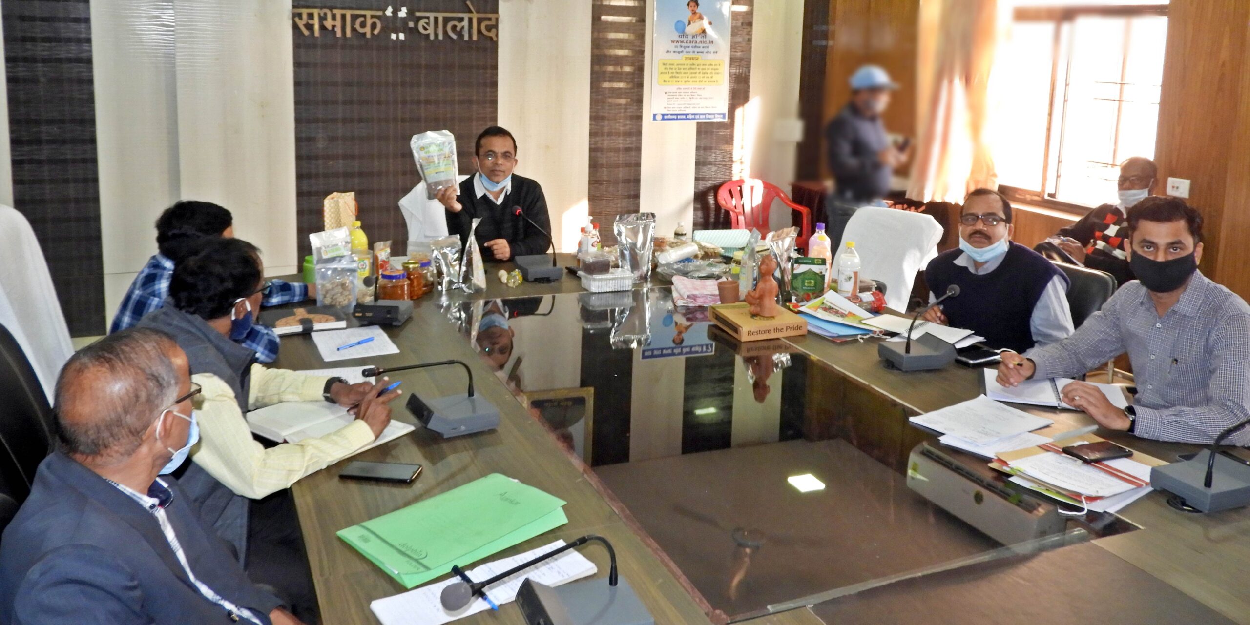 बालोद – कलेक्टर श्री जनमेजय महोबे ने आज शाम संयुक्त जिला कार्यालय के सभाकक्ष में विभिन्न विभागों के अधिकारियों व स्वसहायता समूहों की सदस्यों की बैठक लेकर जिले में चयनित सामग्रियों का उत्पादन करने प्लानिंग के निर्देश दिए। उन्होंने कहा कि राज्य शासन की मंशानुरूप जिले में उत्पादित विभिन्न गुणवत्तायुक्त उत्पादों के विपणन को बढ़ावा दिया जाएगा। उन्होंने कहा कि उत्पादित सामग्री गुणवत्तापूर्ण हो। कलेक्टर ने विभिन्न विभागों और स्वसहायता समूहों द्वारा उत्पादित सामग्री मशरूम, अम्बाड़ी शरबत, गौमूत्र फिनायल, बड़ी, अचार, मसाला, जैविक खाद, बेकरी का सामान, एलोवेरा साबुन, हैण्डलूम, टेराकोटा, आदि का अवलोकन कर उसकी सराहना की।
