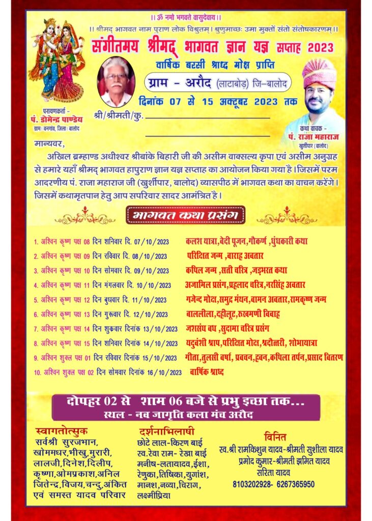बालोद/लाटाबोड़। ग्राम अरौद में 7 से 15 अक्टूबर तक श्रीमद् भागवत कथा का आयोजन पितृ मोक्ष की उपलक्ष पर स्वर्गीय रामकिशुन जी यादव के स्मृति में उनके परिवार के द्वारा ग्राम अरौद के नव जागृति चौक पर भागवत कथा का आयोजन किया जा रहा है।