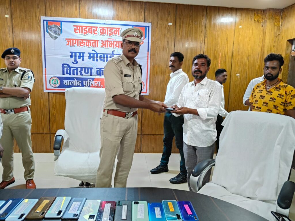 बालोद। पुलिस अधीक्षक बालोद डॉ जितेन्द्र कुमार यादव के मार्गदर्शन तथा अतिरिक्त पुलिस अधीक्षक श्री सुशील कुमार नायक के निर्देशन एवं उप पुलिस अधीक्षक सुश्री नवनीत कौर, उप पुलिस अधीक्षक गीता वाधवानी, एसडीओपी बालोद श्री प्रतीक चर्तुवेदी, उप पुलिस अधीक्षक श्री बोनीफास एक्का, नगर पुलिस अधीक्षक राजहरा श्री राजेश बागड़े के पर्यवेक्षण व सायबर सेल प्रभारी श्री जोगेंद्र कुमार साहू के नेतृत्व में साइबर जागरूकता अभियान में सामुदायिक पुलिसिंग के तहत 81 नग गुम मोबाईल हैण्डसेट सायबर सेल टीम द्वारा दीगर राज्य एवं दिगर जिलों से रिकवर किया गया।
