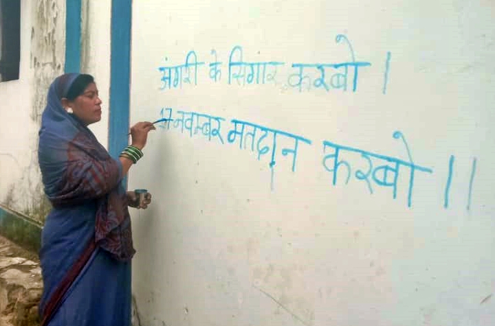 दीवाल लेखन के अंतर्गत ‘‘लोकतंत्र के मान रखव, 17 नवम्बर के मतदान करव‘‘, लोकतंत्र के तिहार कब-17 नवम्बर के मतदान तब, लोकतंत्र के बढ़ाबो मान-17 नवम्बर को करबो मतदान आदि स्लोगन के माध्यम से मतदाता जागरूकता का संदेश दिया जा रहा है।