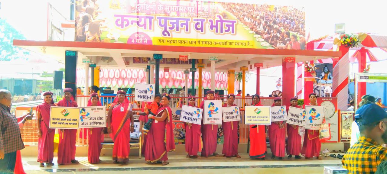 वहीं महिला कमांडो इसी परिसर में तख्तियां लेकर लोगों को मतदान के लिए भी प्रोत्साहित कर रही है। करबो मतदान की थीम पर जिले की महिला कमांडो अपने-अपने क्षेत्र में दुर्गा पंडाल, देवी मंदिरों सहित अन्य सार्वजनिक जगहों पर लोगों को शत प्रतिशत मतदान के लिए प्रेरित कर रही है।