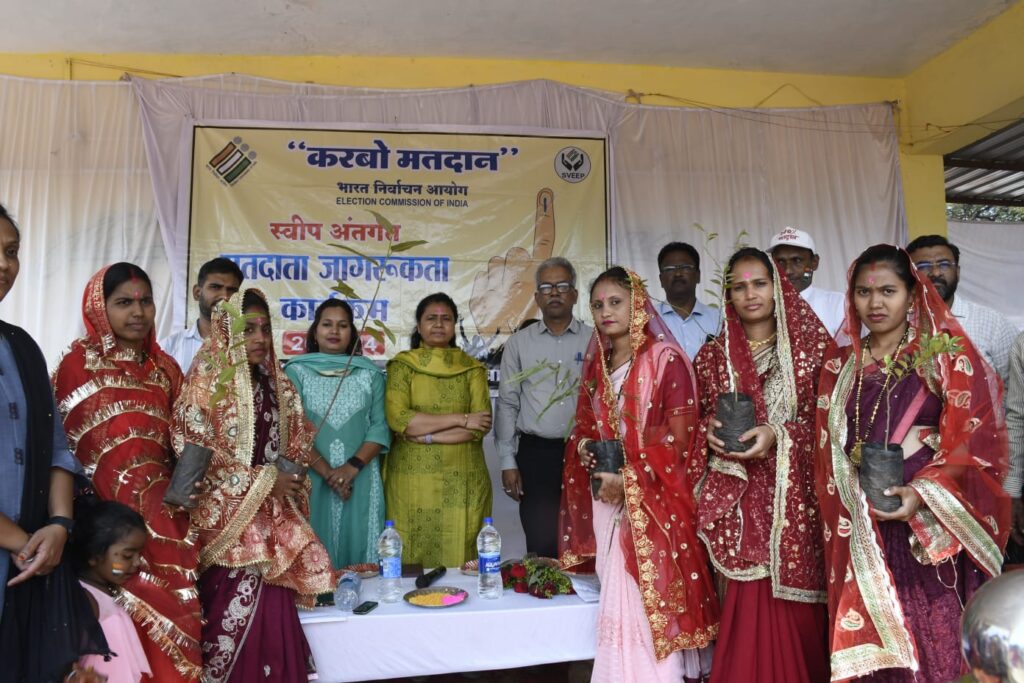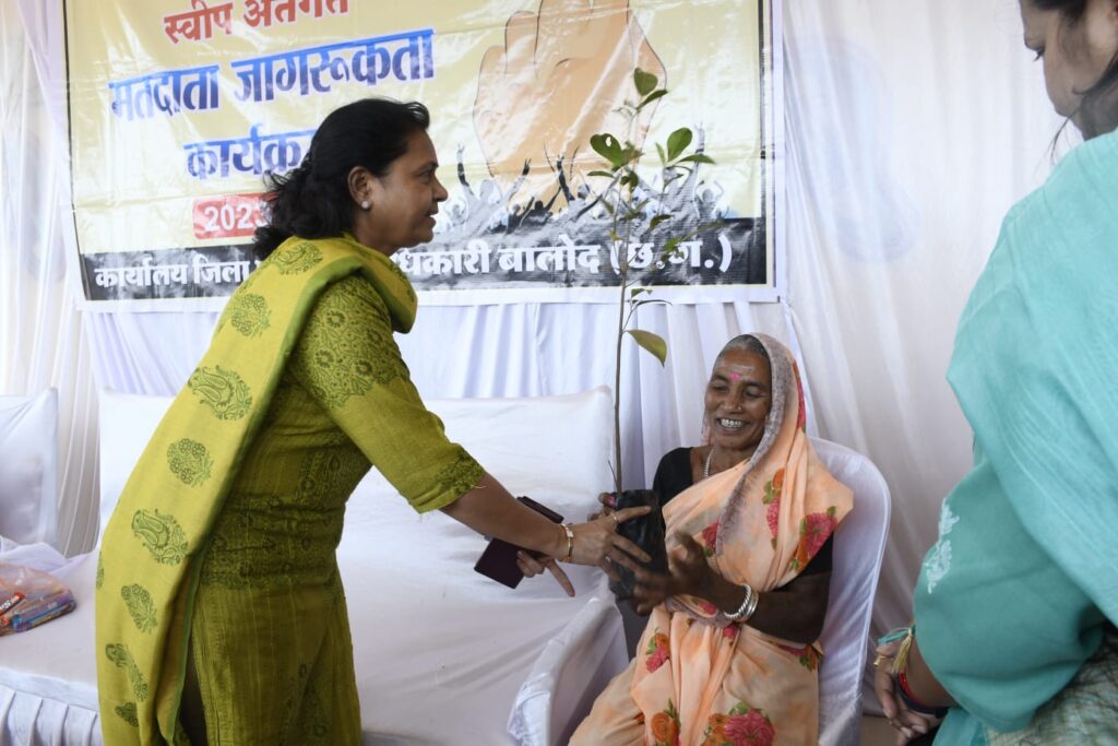 इस अवसर पर उन्होंने 80 वर्ष से अधिक उम्र के बुजुर्ग मतदाताओं, नववधु और नवीन मतदाताओं को पौधा भेंटकर सम्मानित भी किया। कार्यक्रम में उपस्थित लोगों से निर्वाचन संबंधी विभिन्न सवाल भी क्वीज प्रतियोगिता के रूप में पुछे गए, जिसका सही जवाब देेने वालों को सम्मानित करते हुए पौधा भेंट किया गया। इस अवसर पर उपस्थित लोगों ने वृहद आकर्षक रंगोली का निर्माण किया। जिसके आसपास मानव श्रृंखला के माध्यम से आकृति बनाकर शत प्रतिशत मतदान का संदेश दिया गया। इस अवसर पर एसडीएम श्री सुरेश साहू, जिला कार्यक्रम अधिकारी एवं स्वीप के सहायक नोडल अधिकारी श्री विपीन जैन, नगर पालिका परिषद के अधिकारी-कर्मचारी एवं बड़ी संख्या में आम नागरिक उपस्थित थे।