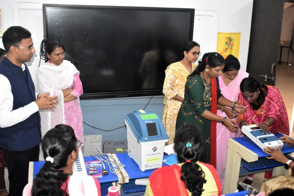 इस दौरान उन्होंने प्रशिक्षण प्राप्त कर रहे अधिकारी-कर्मचारियों से ई.व्ही.एम. के संचालन तथा मतदान केंद्र में पहुँचने के पश्चात् सर्वप्रथम उनके द्वारा किया जाने वाला माॅक पोल आदि कार्य के संबंध में विस्तारपूर्वक जानकारी दी। श्री शर्मा नेे मतदान अधिकारियोें से ई.व्ही.एम के हैण्ड्स आॅन आदि के संबंध में भी जानकारी ली। उन्होंने संगवारी मतदान केंद्रों के मतदान अधिकारी के रूप में प्रशिक्षण प्राप्त कर रहे महिला अधिकारी-कर्मचारियों द्वारा किए जा रहे ईव्हीएम के हैण्ड्स आॅन के कार्य का भी अवलोकन किया। उन्होंने सभी अधिकारी-कर्मचारियों को पूरी गंभीरता एवं बेहतर तरीके से पूरी प्रक्रिया को समझने को कहा। इसके अलावा उन्होंने अधिकारी-कर्मचारियों को सभी प्रकार के जिज्ञासाओं एवं शंकाओं का समाधान प्रशिक्षण स्थल पर ही करने को कहा। जिससे की प्रशिक्षण के पश्चात् किसी भी प्रकार का संशय की स्थिति न रहे।