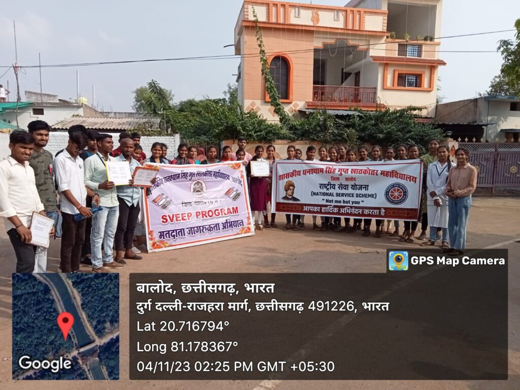 राष्ट्रीय सेवा योजना के सीनियर स्वयंसेवक डिलेश्वर कुमार देशमुख ने सभी स्वयंसेवक को जिनका उम्र 18 वर्ष और उससे अधिक है सभी को वोटर आईडी कार्ड बनवाने की बात कही और जिन स्वयंसेवकों का मतदाता परिचय पत्र बन चुका है, उन सभी को आने वाले 17 नवंबर को अपने मत के अधिकार का प्रयोग कर मतदान देने की बात कही। सीनियर स्वयंसेवक लक्ष कुमार साहू ने भी मतदाता जागरूकता से संबंधित नारा का वाचन किया और मतदान के महत्व को बताया उन्होंने कहा कि मतदान करना प्रत्येक भारतीय नागरिक का कर्तव्य है । एक-एक वोट समाज और देश के विकास के लिए कीमती है , इसलिए समाज के सभी वर्गों , जाति, धर्म , अमीर हो या गरीब सभी को मतदान देने जाना चाहिए और सही प्रत्याशी को वोट देने की बात कही। इसके पश्चात सभी स्वयंसेवकों के द्वारा महाविद्यालय परिसर और जुर्री पारा में चुनाव संबंधित नारे का वाचन करते हुए जागरूकता रैली निकाली गई और सभी को 17 तारीख के मतदान हेतु प्रेरित किया गया । राष्ट्रीय सेवा योजना के इस आयोजन में स्वयंसेवक देवर्षि बेलसर , लोकेश्वर निर्मलकर , डीपनारायण द्विवेदी , कांक्षी , यामिनी कुरेशिया, निशा खरे , मनीष, राधेश्याम , डेलिस , शशिकांत, राजेश बक्शी, तनुजा, दीपिका साहू , तृप्ति, कल्पना, नम्रता, निधि चंद्राकर , प्रियंका मांडवी, बिनीता मांडवी , रामावतार , यूनिस कुमार , शिवा , नवीन कुमार इत्यादि सभी स्वयंसेवकों की सक्रिय भागीदारी रही। यह कार्यक्रम राष्ट्रीय सेवा योजना कार्यक्रम अधिकारी प्रो. जी. एन. खरे के निर्देशन में सफलतापूर्वक संपन्न रहा।