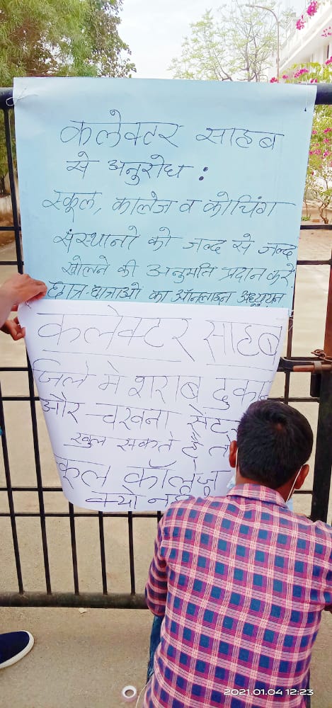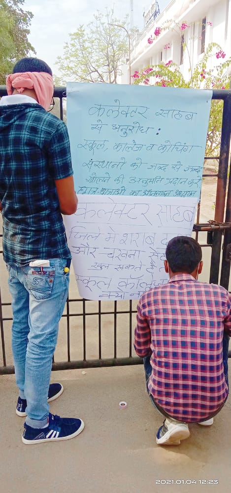 राजनांदगांव।भारतीय जनता पार्टी के शहर उपाध्यक्ष नागेश यदु के नेतृत्व में आज विद्यार्थियों ने जिला कार्यालय में अनोखा प्रदर्शन करते हुए जमीन बैठकर अपनी मांगों को पोस्टर , आवेदन पत्र लिखकर कलेक्ट्रेट परिसर के गेट पर चस्पा करते हुए जल्द से जल्द स्कूल कॉलेज खोलने की मांग की । विद्यार्थियों ने सरकार की उदासीनता पर नाराजगी व्यक्त करते हुए कहा कि विश्व स्वास्थ्य संगठन का कोरोना महामारी के लिए साफ दिशा निर्देश है कि कोरोना वायरस का प्रभाव बुजुर्ग व छोटे बच्चों पर अधिक है इसलिए बुजुर्ग और छोटे बच्चों का ध्यान रखना जरूरी है उसके बावजूद जिला प्रशासन शहर के वार्डो में आंगनबाड़ी खोलने के लिए वार्ड पार्षद दबाव बना रहे है जो कि किस मंशा से है इससे सभी लोग भलीभांति परिचित है , शासन प्रशासन सिर्फ कमीशन प्राप्त सुविधाओं को ही संचालित करना चाहती है तो हम विद्यार्थी भी घरों घर जाकर चंदा इकट्ठा करने तैयार है । अगर राज्य सरकार व जिला प्रशासन शिक्षा क्षेत्र के प्रति अपनी गंभीरता नही दिखाएगी तो आने वाले समय यह आंदोलन और तेज होगा ।