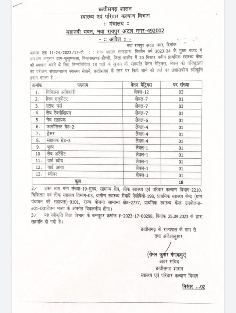 दल्लीराजहरा। ग्राम पंचायत कुसुमकसा के ग्रामीणों की बहुत ही पुरानी मांग 20 बिस्तर अस्पताल जिसके प्रशासनिक स्वीकृति मिलने से कुसुमकसा और आस पास क्षेत्र में खुशी का माहौल है। जनपद सदस्य संजय बैस, सरपंच शिवराम सिंद्रामे, विकासखंड चिकित्सा अधिकारी विजय ठाकुर को प्रस्ताव की कापी सौपा।