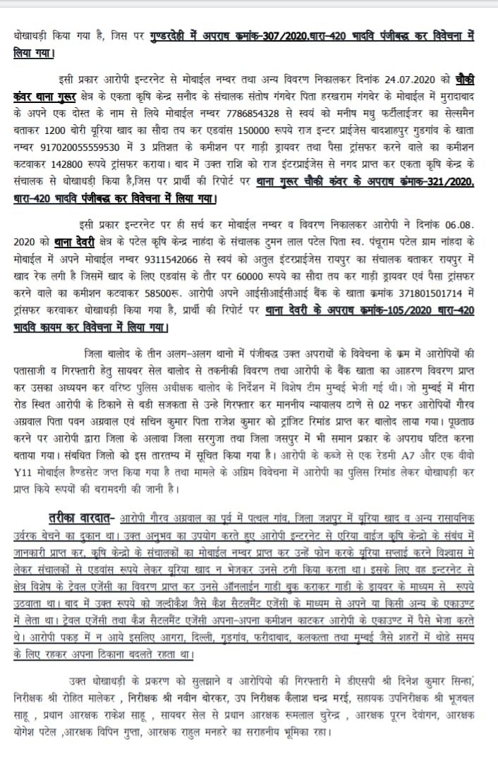 बालोद। बालोद जिले के अलग-अलग थाना क्षेत्रों में यूरिया सप्लाई के नाम पर ठगी करने वाले दो आरोपियों को पुलिस ने पकड़ने में सफलता हासिल की है। मामले का खुलासा बुधवार को एएसपी डीआर पोर्ते ने किया। पकड़े गए आरोपी रिश्ते में जीजा साला हैं। जो कि मूल निवासी पत्थलगांव के हैं। लेकिन वर्तमान में वे दोनों मुंबई के मीरापुर इलाके में किराए के मकान में रहते थे। जहां से पुलिस ने उन्हें गिरफ्तार किया। एएसपी ने बताया कि मुख्य आरोपी जीजा गौरव अग्रवाल पूर्व में पत्थलगांव जिला जशपुर में यूरिया खाद व अन्य रसायनिक उर्वरक बेचने का दुकान चलाता था। अपने अनुभव का फायदा उठाते हुए वह इंटरनेट से एरिया वाइज कृषि केंद्रों के संबंध में जानकारी हासिल करता था फिर उनका मोबाइल नंबर निकालता था और उन्हें यूरिया सप्लाई के नाम से झांसे में लेता था। बकायदा ट्रैवल एजेंसी के जरिए वह खाद की बुकिंग करवाता था और गाड़ी उक्त दुकान तक भेज कर बदले में पैसा अपने खाते में ट्रांसफर करवा लेता था। तो वही इस काम में उनका साला सचिन कुमार निवासी बादशाहपुर गुड़गांव हरियाणा हाल मुकाम मीरा रोड मुंबई भी साथ देता था। दरअसल में जीजा काफी पैसों का खर्चीला था। जो कि बार जाने, शराब पीने सहित अन्य चीजों में काफी पैसा उड़ाता था। घर वाले ने उनके पैसे खर्च को देख कर उसे झगड़ा कर उसे घर से निकाल दिया था। जिसके बाद वह अपनी पैसों की जरूरत को पूरा करने के लिए अपने अनुभव का सहारा लेते हुए इस तरह खाद सप्लाई के नाम पर ठगी करना शुरू कर दिया। एएसपी ने कहा कि आरोपियों ने छत्तीसगढ़ में और कहां कहां ठगी की है। इसकी जांच चल रही है। अभी मामले में और कार्यवाही शेष है। बालोद जिले में उक्त आरोपियों द्वारा तीन थाना क्षेत्र में ठगी करने की बात स्वीकार की गई है। वहीं अन्य जिलों से भी इस संबंध में जानकारी हासिल कर रहे हैं। मुख्य आरोपी काफी शातिर था जो कि हर ठगी के पास मोबाइल फेंक देता था या नंबर ही बदल देता था। काफी मुश्किलों का सामना करके हमारी साइबर टीम के जरिए सुराग मिला और मामले में सफलता हासिल हुई। मुंबई के मीरापुर में भी पुलिस ने उन्हें बड़ी मुश्किल से तलाशा। कोई उनका पता बताने के लिए भी तैयार नहीं होता था।