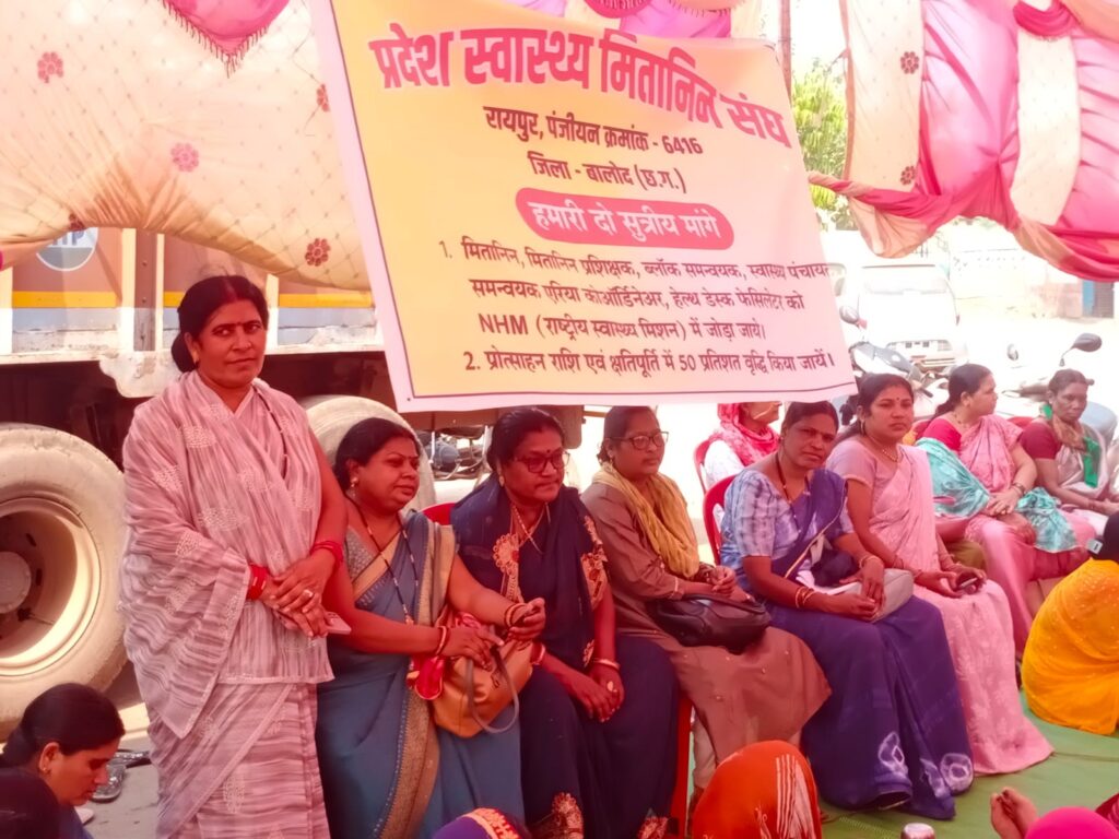 गुरुवार को बालोद ब्लाक की मितानिन बस स्टैंड में धरने पर बैठी मितानिन कार्यक्रम को राष्ट्रीय स्वास्थ्य मिशन में संलग्न करें : महेश्वरी साहू