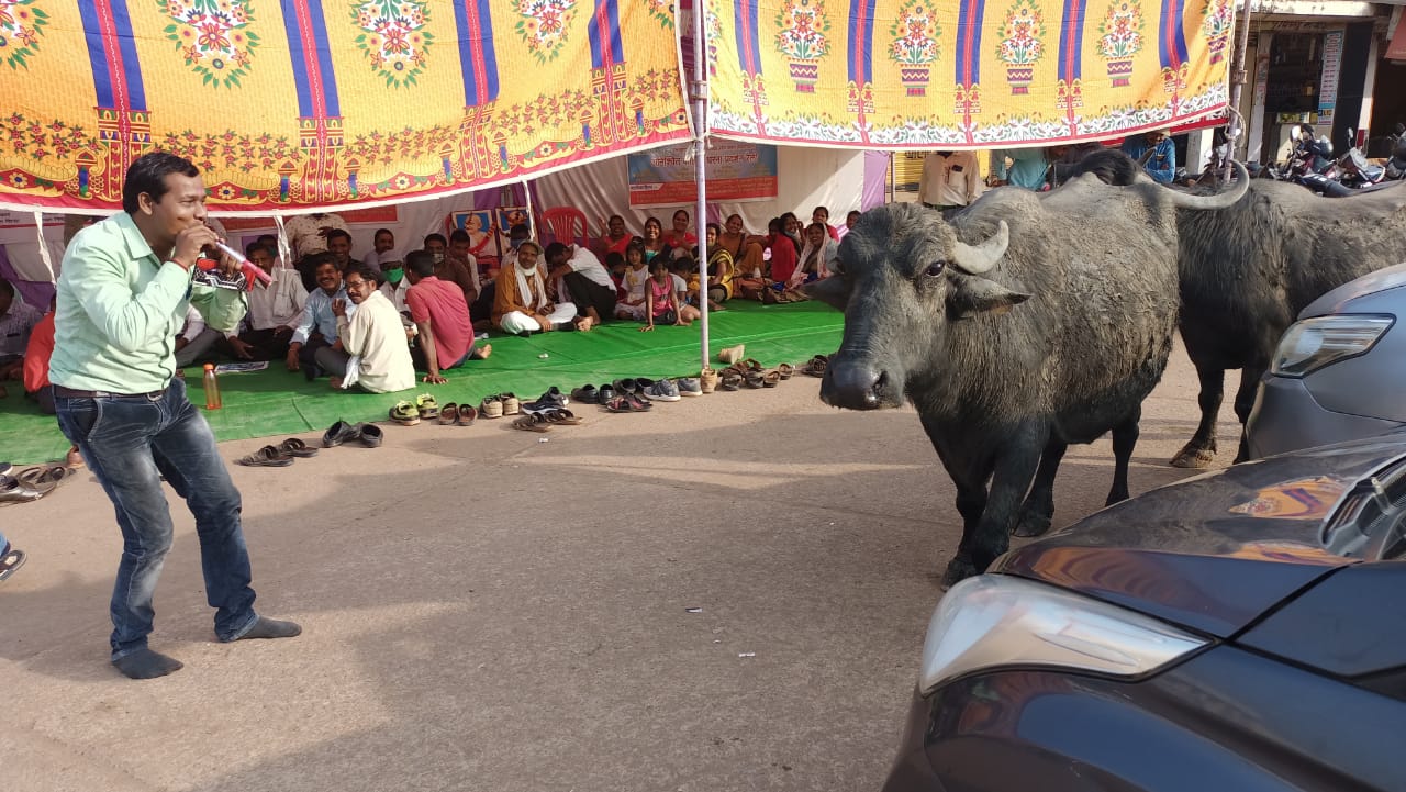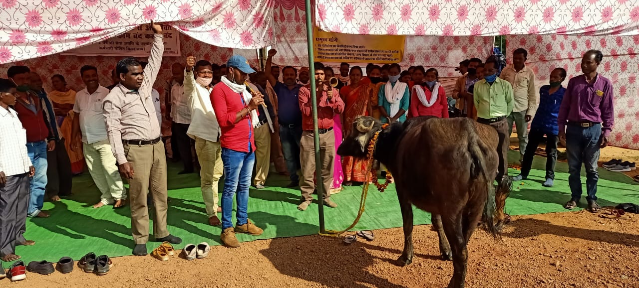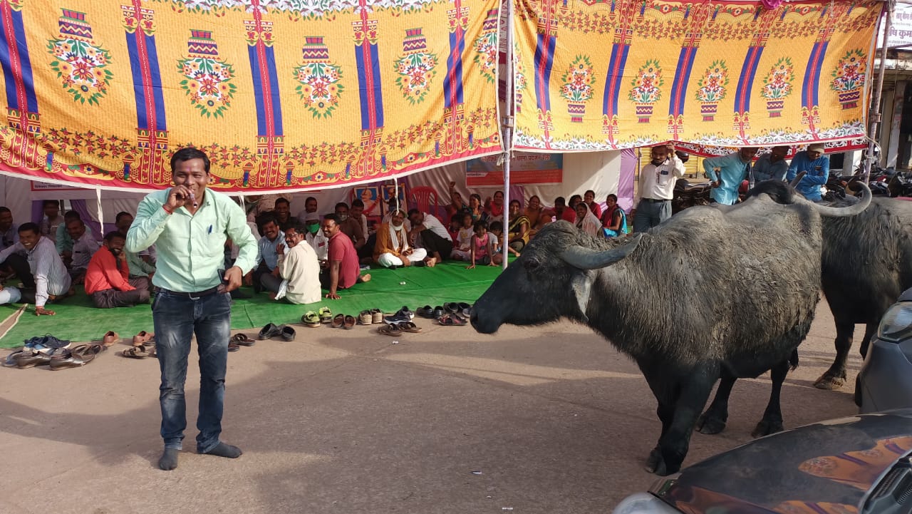 बालोद – पंचायत सचिवों ने आज हड़ताल के दौरान अपनी मांगे अनुसनी करने पर सरकार के खिलाफ रोचक अंदाज में प्रदर्शन किया एक कहावत को आज सचिवों ने असल कर दिखाया और कहीं से भैंस लाकर उसके सामने बीन बजाने लगे यह नजारा देखने लायक था बस स्टैंड में धरने पर बैठे सचिवों को ऐसा करते देख आसपास मौजूद अन्य लोग भी खुद को रोक नहीं पाए और यह दृश्य देखने उमड़ पड़े प्रदेश पंचायत सचिव संगठन छग के प्रांतीय आहवान पर पंचायत सचिव आज 17 वे दिन बस स्टैंड बालोद में धरना प्रदर्शन स्थल पर अपने एक सूत्रीय मांग 2 वर्ष तक परिवीक्षा अवधि के समाप्ति पश्चात शासकीय करण को लेकर धरने पर बैठे रहे। पंचायत सचिव विगत 17 दिनों से अलग गतिविधियों के माध्यम से जैसे दिनांक 7.1.2021 को सरकार को सद्बुद्धि देने यज्ञ किया गया। दिनांक 8.1.2021 को धरना प्रदर्शन स्थल पर संगीत मय रामायण पाठ किया गया। 9.1.2021 को धरना प्रदर्शन स्थल एवं बस स्टैंड बालोद में सरकार को भीख देने भीख मांग कर सरकार के कोष में जमा किया गया। लेकिन अभी तक छत्तीसगढ़ सरकार द्वारा पंचायत सचिव के मांग के संबंध में किसी भी प्रकार का विचार नहीं किया जा रहा है। इससे क्षुब्ध होकर पंचायत सचिव ने 11.1.2021 को सरकार को जगाने भैंस के सामने बीन बजा कर सरकार के विरुद्ध प्रदर्शन किया।