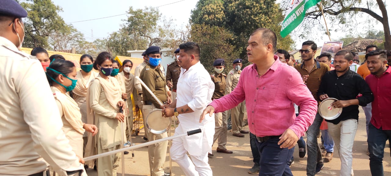दोपहर 1:00 बजे युवा कांग्रेस के नेता और कार्यकर्ता आंदोलन प्रभारी व प्रदेश के सचिव दीक्षा पांडे के नेतृत्व में घेराव करने के लिए पहुंचे।
