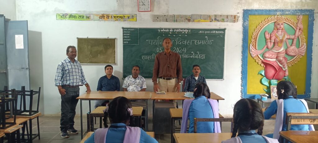गोष्ठी का टॉपिक था पर्यावरण को सुरक्षित कैसा रखा जाए? इस अवसर पर विचार व्यक्त करते हुए ,जे.पी. बांधव व्याख्याता ने कहा कि -पर्यावरण दिवस के दिन हम सब शपथ लेकर एक पेड़ अवश्य लगाए और उसे सुरक्षित रखने के लिए एक-एक पेड़ गोद लें। जिससे पर्यावरण सुरक्षित व संतुलित रह सके। मुखर्जी सर ने कहा कि- पर्यावरण की अगर सुरक्षा चाहते हैं ,तो पेड़ों की कटाई पर विराम लगाने के साथ-साथ उसकी देखभाल करते हुए अधिक से अधिक पेड़ लगाकर इसे सुरक्षित रखा जा सकता है। कार्यक्रम का सफल संचालन व संपादन डॉक्टर बी .एल .साहसी (व्याख्याता) ने किया। संचालन के दौरान उन्होंने कहा कि- आज लगातार वनों की कटाई जिस तेजी से हो रही है जिससे पर्यावरण प्रदूषित होते जा रहा है, जिसकी वजह से समय में बारिश पर्याप्त रूप से नहीं हो पा रहा है। आम जनता के साथ-साथ किसानों के लिए जो चिंता का विषय है क्योंकि अधिकांशतः