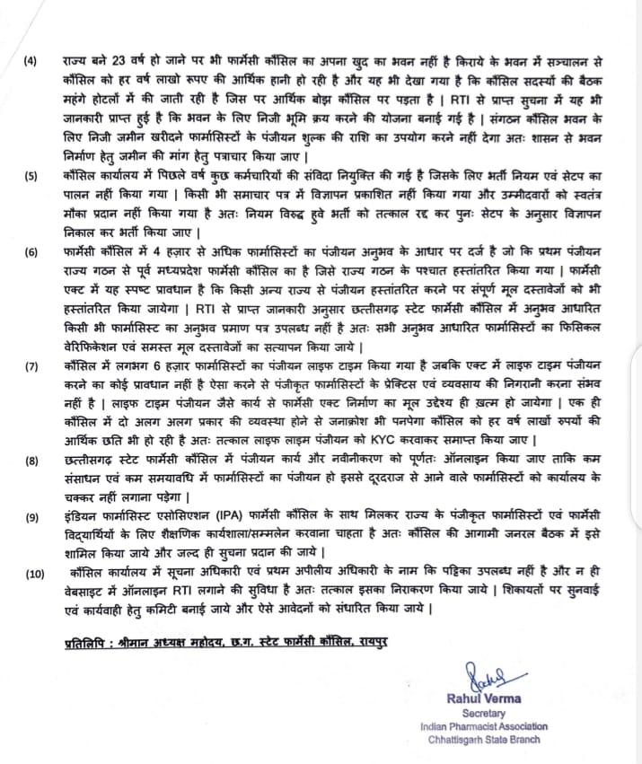 दस बिंदुओं में सौंपें गये ज्ञापन में अनुभव आधारित पंजीयनों की जाँच , लाइफ टाइम पंजीयन को ख़त्म करना ताकि 4000 अवैध पंजीयनों की जाँच हो सके, मेडिकलों में फ़ार्मासिस्ट की उपस्थिति जाँचने फ़ार्मेसी इंस्पेक्टर की नियुक्ति, पंजीयन को पूर्णतः ऑनलाइन करना, कौंसिल ऑफिस की स्वयं की बिल्डिंग निर्माण, एवम फ़ार्मेसी पेशे के नियमों का कड़ाई से पालन करवाने की माँग की गई है।इंडियन फार्मासिस्ट एसोसिएशन छत्तीसगढ़ स्टेट ब्रांच सचिव राहुल वर्मा ने कहा