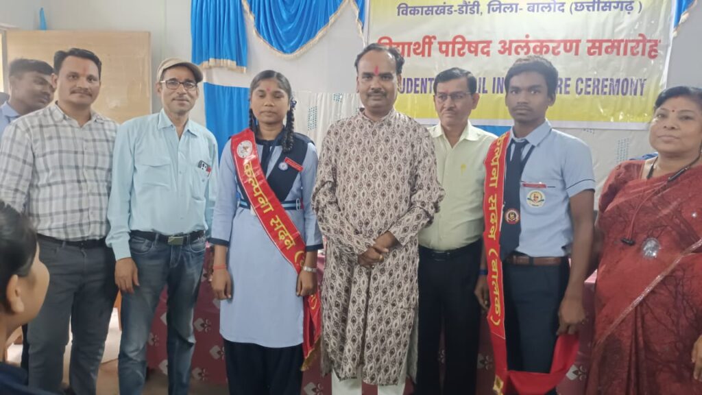 बालोद। स्वामी आत्मानंद शासकीय उत्कृष्ट अंग्रेजी/ हिंदी माध्यम विद्यालय कुसुमकसा में विद्यार्थी परिषद का शपथ ग्रहण समारोह का आयोजन हुआ। जिसमें सभी छात्र संघ पदाधिकारियों की शपथ के साथ उन्हें जिम्मेदारियां भी सौंपी गई। जिससे शाला का प्रभावी संचालन होती रहे l छात्र-छात्राएं शाला उन्नति के लिए समर्पित हो सके। शाला के विद्यार्थी संस्कारवान और सुयोग्य बन सके। कार्यक्रम का शुभारंभ स्कूल बैंड के सधे हुए कदमों व धुंन द्वारा अतिथियों को गार्ड ऑफ ऑनर के साथ किया गया। तत्पश्चात सरस्वती वंदना सुश्री पूजा रात्रे द्वारा प्रस्तुत किया गया। मुख्य अतिथि संजय बैस जनपद सदस्य डौण्डी ने कहा की शाला में बच्चों का नेतृत्व क्षमता बढ़ाने और उन्हें अनुशासन का पाठ पढ़ाने का सबसे सही अवसर है जिससे बच्चे पढ़ाई के साथ-साथ अन्य गतिविधियों में निरंतर आगे बढ़ते रहें छात्र जीवन में जिम्मेदारियां निभाने से नेतृत्व क्षमता का विकास होता है ,जो राष्ट्र निर्माण तथा समाज सेवा का आधार होता है।