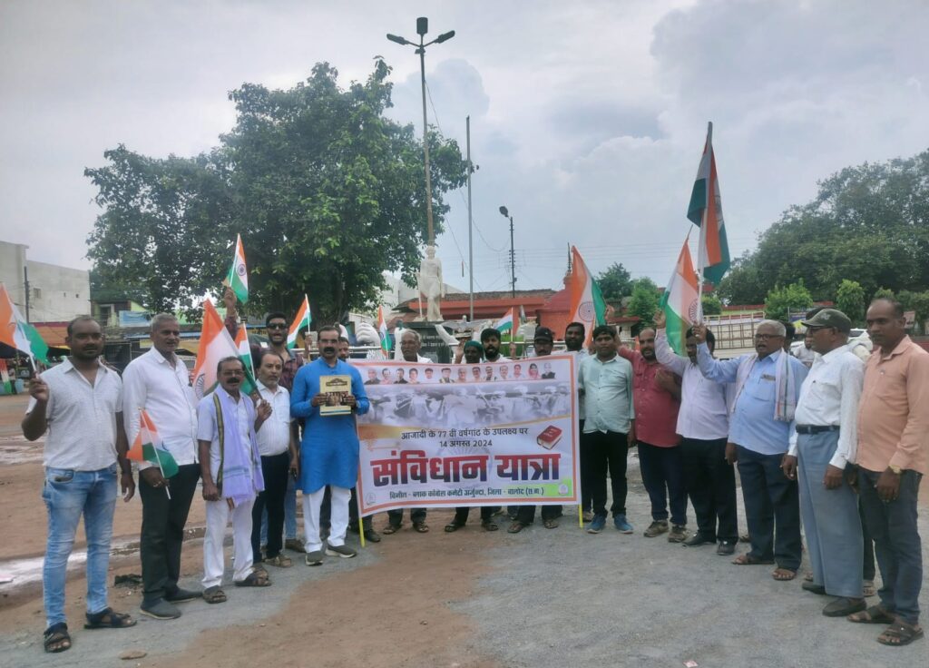 बालोद। ब्लाक कांग्रेस कमेटी गुंडरदेही के अध्यक्ष श्री भोजराज साहू के आह्वान पर गुंडरदेही के लोकप्रिय विधायक श्री कुंवरसिंह निषाद के नेतृत्व में आजादी की 77 वीं वर्षगांठ के अवसर पर संविधान की रक्षा की प्रतिज्ञा करते हुए बस स्टैंड गुंडरदेही से धमतरी चौक होते हुए पेंशनर भवन तक संविधान यात्रा निकाली गई।