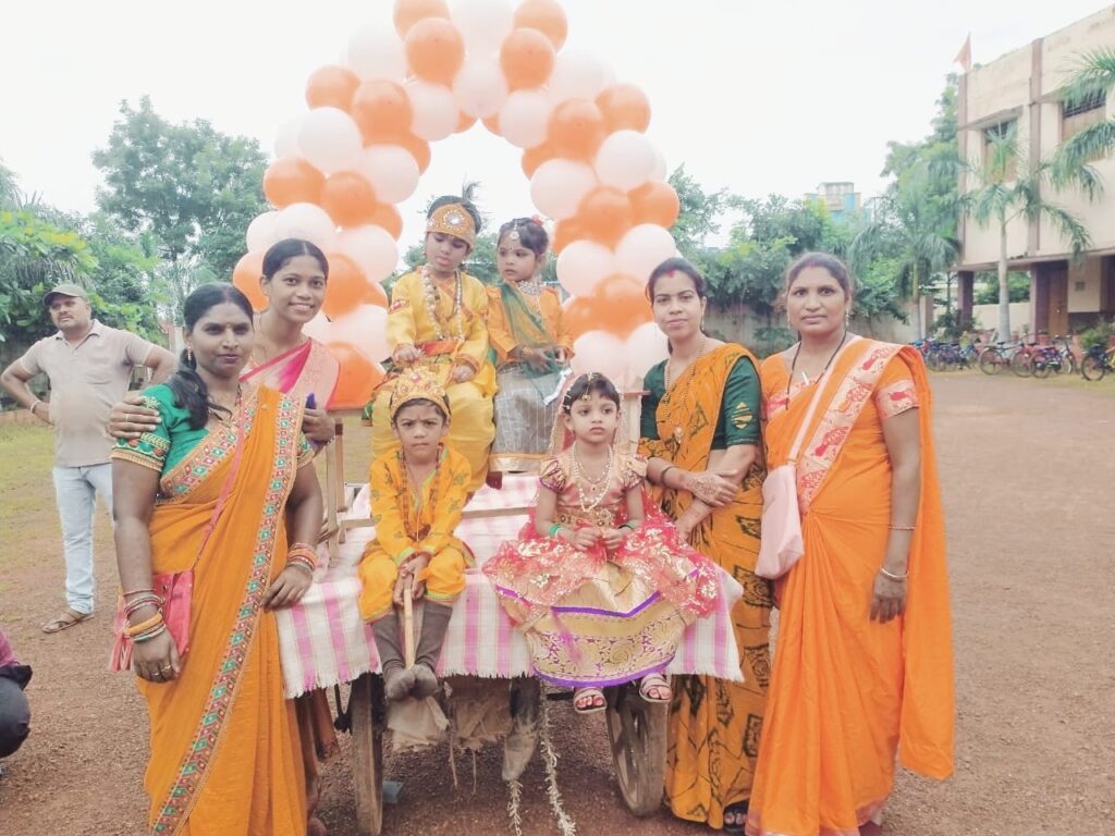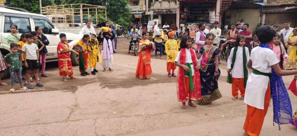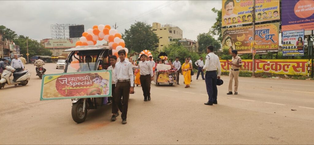 तत्पश्चात विभिन्न झांकियां कारागाह में श्री कृष्ण का जन्म, श्री कृष्ण बलराम सहित दही लूट, अर्जुन को गीता उपदेश देते श्री कृष्ण, राधा कृष्ण की मनोरम झांकी के साथ स्कूली भैया बहनों का भव्य शोभायात्रा नगर भ्रमण के लिए निकली, जिसके चौक- चौराहे पर छोटे भैया बहनों के द्वारा श्री कृष्ण जन्म उत्सव की मंगल नृत्य के साथ नगर वासियों को बधाई व शुभकामनाएं प्रेषित की गयी। वही नगर वासी भी चौक चौराहे पर पुष्प वर्षा कर मनोरम झांकी का स्वागत करते हुए व हाथी घोड़ा पालकी जय कन्हैया लाल की जय घोष लगाते दिखे। इस अवसर पर प्राचार्य दीनदयाल साहू समस्त आचार्य दीदीया पूर्व आचार्य श्री अवधेश राजपूत वरिष्ठ पालक विमल राखेचा एवं पूर्व छात्र उपस्थित थे।