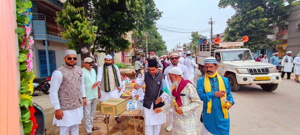 बालोद। मुस्लिम समाज बालोद के द्वारा जश्ने ईद मिलादुन्नबी के मौके पर जुलूस ए मोहम्मदी का आयोजन शांतिपूर्ण तरीके से किया। इसके पुर्व 9.15 मिनट में जामा मस्जिद बालोद में परचम कुसाई की गयी जिसके बाद फातिहा खानी का आयोजन हुआ फिर जुलूस शहर के जामा मस्जिद से प्रारंभ होकर पुराना बस स्टैंड,सदर रोड,हलधर चौक,मधु चौक ,जय स्तंभ चौक मुख्य मार्ग होते हुए वापस जामा मस्जिद पहुंची इस दौरान जगह जगह फ्रुटी, बिस्किट, चाकलेट,केक सहित पानी का वितरण किया गया शहर के राजनांदगांव मार्ग में मुस्लिम समाज के वरिष्ठ समाजसेवी एवं भाजपा अल्पसंख्यक मोर्चा के जिलाअध्यक्ष मो अकबर तिगाला एवं परिवार की ओर से बच्चों सहित बड़ो के लिए विभिन्न खाद्य सहित पेयजल सामग्री का वितरण किया गया। वही दोपहर 12 बजे से जामा मस्जिद के पास लंगर का आयोजन किया गया जिसके बाद दिन भर विविध आयोजन किए जाएंगे।