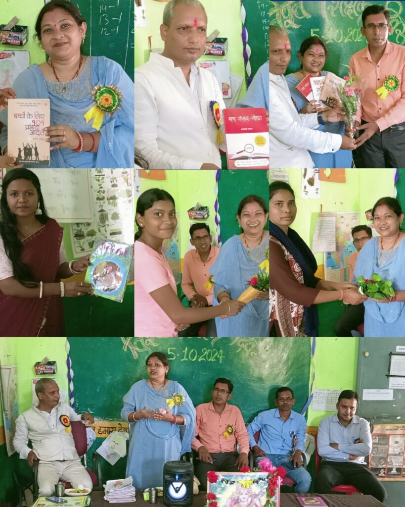 आयोजन में ईश्वरी कुमार सिन्हा द्वारा सभी शिक्षकों एवं पालकों को ज्ञान की गंगा “गीता” एवं शिक्षा एवं विद्या – पं. श्रीराम शर्मा आचार्य,भाषा -संशय और शोधन,वैदिक गणित,बच्चों के लिए 101 प्रभावी बातें अन्य महत्वपूर्ण पुस्तको के साथ एक नीम का एक पेड़ भेंट किया गया। वहीं श्रीमती कादंबिनी के द्वारा बच्चों को कलर पेंसिल एवं विद्यालय को चार्ट एवं कलर सेट प्रदान किया गया। साथ ही