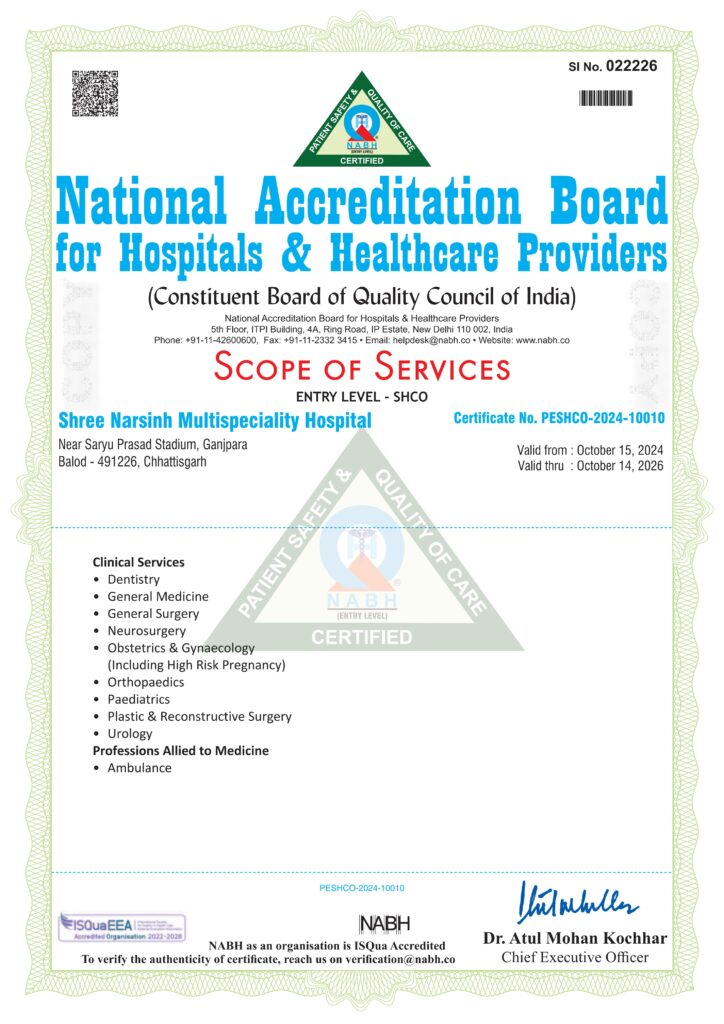 जिला एवं क्षेत्र में मानकीकृत एवं अत्याधुनिक चिकित्सा सेवा देने में पहचाने जाने वाले श्री नरसिंह मल्टी स्पेशलिटी अस्पताल बालोद को नेशनल एक्रीडिटेशन बोर्ड का हॉस्पिटल एंड हेल्थ केयर प्रोवाइडर द्वारा एंट्री लेबल एनएबीएच सर्टिफिकेशन प्राप्त हुआ है। इस तरह का प्रमाणन राष्ट्रीय स्तर पर गुणवत्ता प्रमाणीकरण प्राप्त करने वाला जिला एवं क्षेत्र में पहला अस्पताल है। अस्पताल प्रबंधन द्वारा इस बारे में जानकारी दी गई कि मरीजों की गुणवत्तापूर्ण इलाज एवं सुरक्षा के मानकीकृत प्रोटोकॉल का पालन करते हुए यह प्रमाण पत्र मिला है। जिसके लिए एनएबीएच की टीम द्वारा निरीक्षण करने उपरांत संतुष्टि जाहिर करते हुए अन्य बेहतर सुधार के लिए भी निर्देशित किया गया। अस्पताल प्रबंधन ने स्वास्थ्य क्षेत्र में गुणवत्तापूर्ण सेवा देने के लिए अपना संकल्प दोहराते हुए भविष्य में सभी प्रमुख बीमा कंपनियों द्वारा कैशलेस इलाज, राज्य सरकार एवं केंद्र सरकार के कर्मचारियों को भी बालोद जिला में ही संपूर्ण सुविधा एवं इलाज के लिए प्रयास कर रहा है। जिसकी सुविधा शीघ्र ही मिलेगी। एनएबीएच द्वारा कुल 10 विभागों में जिसमें दंत रोग, मेडिसिन, न्यूरो सर्जरी स्त्री रोग आदि विभागों के प्रमाणन मिला है। प्रबंधन के अनुसार संस्थान के सभी मेडिकल स्टाफ, चिकित्सकों के अथक प्रयास एवं मरीजों की इलाज में संतुष्टि से यह प्रमाणन मिला है।