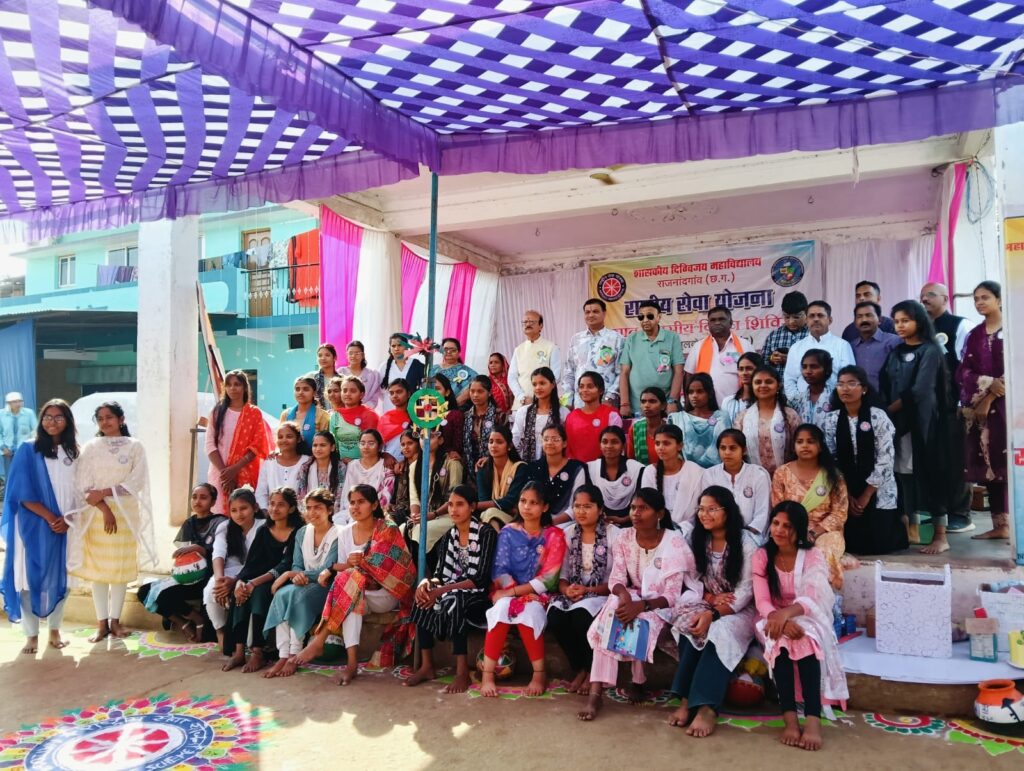 राजनांदगांव। शासकीय दिग्विजय महाविद्यालय राजनांदगांव में संचालित राष्ट्रीय सेवा योजना इकाई द्वारा संस्था के प्राचार्य डॉ अंजना ठाकुर मैम के संरक्षण एवं मार्गदर्शन में राष्ट्रीय सेवा योजना कार्यक्रम अधिकारी इकाई 01 प्रो. संजय सप्तर्षि , इकाई 2 प्रो. करुणा रावटे के नेतृत्व में सात दिवसीय विशेष शिविर ग्राम कुतुलबोर्ड भाटागांव का आयोजन, युवा भारत के लिए युवा, डिजिटल भारत के लिए युवा विषय पर आयोजित किया गया है। सात दिवसीय विशेष शिविर में सुबह 5 बजे प्रभात फेरी उसके पश्चात 6 बजे योगाभ्यास, 7 बजे नाश्ता 8 बजे से 11 बजे तक परियोजना कार्य जिसके अंतर्गत स्वयंसेवियों द्वारा गांव में अनेकों जागरूकता कार्यक्रम एवं श्रमदान किया जाता था। इसके पश्चात 2 बजे से 4 बजे तक बौद्धिक परिचर्चा सत्र जिसमें अलग अलग दिवस पर विषय विशेषज्ञ एवं अधिकारी गण उपस्थित होकर ग्राम वासियों ओर स्वयंसेवियों को मार्गदर्शित करते थे। 4 से 5 देशी खेलकूद 5 से 6 ग्राम भ्रमण, रात्रि भोजन करने के बाद 8 से 10 सांस्कृतिक कार्यक्रम जिसके अंतर्गत जागरूकता एवं छत्तीसगढ़ी संस्कृति से संबंधित कार्यक्रम ग्राम वासियों को जागरूक करने के उद्देश्य से स्वयंसेवियों द्वारा प्रस्तुति दिया जाता था।