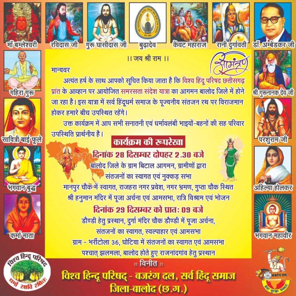 बालोद । विश्व हिंदू परिषद छत्तीसगढ़ प्रांत के आह्वान पर समरसता संदेश यात्रा का शुभारंभ नर्मदा मैया मंदिर नर्मदा (गंडई) से 25 दिसंबर को किया गया है। उक्त यात्रा में सर्व हिन्दू समाज के पूज्यनीय संतजन एवं महात्मा एक सुसज्जित रथ पर विराजमान होकर खैरागढ़, राजनांदगांव, अंबागढ़ चौंकी, मानपुर, मोहला क्षेत्र से होकर 28 दिसम्बर को बालोद जिले में प्रवेश करेगी। सर्वप्रथम बालोद जिले के ग्राम बिटाल में ग्रामीणों के द्वारा रथ यात्रा में पधार रहे साधु महात्मा एवं संतजनों का स्वागत किया जाएगा एवं नुक्कड़ सभा के माध्यम से संतजनों का उद्बोधन होगा। तत्पश्चात मानपुर चौंक में स्वागत, राजहरा नगर प्रवेश, नगर भ्रमण, गुप्ता चौंक स्थित श्री हनुमान मंदिर में पूजा अर्चना एवं आमसभा का आयोजन होगा एवं सरस्वती शिशु मंदिर शाला में रात्रि विश्राम एवं भोजन होगा।