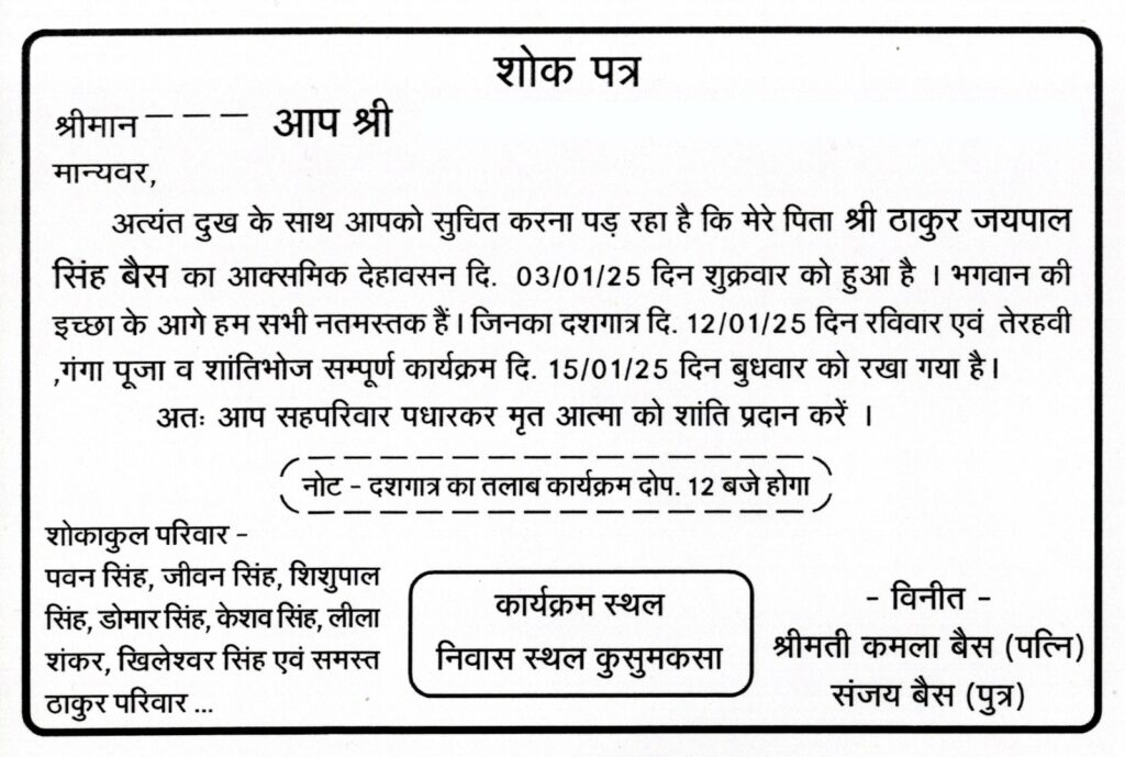 बालोद। कुसुमकसा के निवासी समाज सेवी व जनपद सदस्य संजय बैस के पिता ठाकुर जयपाल सिंह का विगत 3 जनवरी शुक्रवार को निधन हो गया। जिनका दशगात्र 12 जनवरी रविवार और तेरहवीं का कार्यक्रम और शांति भोज 15 जनवरी बुधवार को निज निवास कुसुमकसा में रखा गया है।