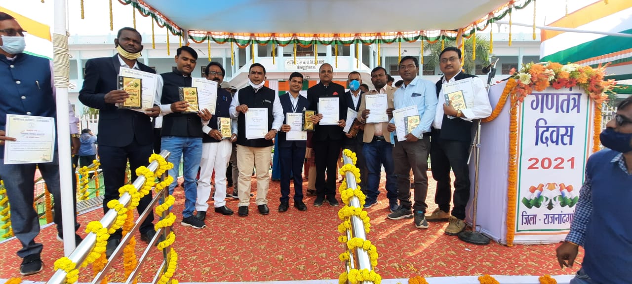 राजनांदगांव-जिला मुख्यालय में गणतंत्र दिवस 2021 के पावन अवसर पर जिले के प्रभारी मंत्री व छत्तीसगढ़ शासन के वन मंत्री मोहम्मद अकबर द्वारा जिले में उल्लेखनीय कार्य करने वाले शिक्षकों और अधिकारियों को प्रशस्ति पत्र और स्मृति चिन्ह देकर संम्मानित किया गया। इसी कड़ी में स्कूल शिक्षा विभाग अधिकारी व मोहला, मानपुर और चौकी के शिक्षकों का भी प्रभारी मंत्री ने सम्मान किया। जिले में उल्लेखनीय कार्य के लिए एपीसी सतीश ब्यौहरे, मोहला एबीईओ राजेन्द्र कुमार देवांगन, सोमाटोला से शिक्षक राजकुमार यादव, कुंजामटोला से शिक्षक लोकेश सिंह ठाकुर, मुचर से शिक्षक शेख अफ़ज़ल, मानपुर ब्लॉक के मुंजाल में पदस्थ शिक्षक अंगद सलामे, चौकी ब्लॉक के तरियापारा के शिक्षक भजन साहू का भी सम्मान किया गया।