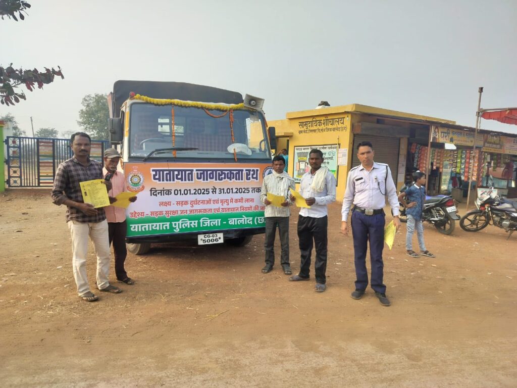 यातायात सड़क सुरक्षा माह 2025 के दौरान यातायात जागरूकता रथ मालीघोरी, दुधली, डेंगरापार के साप्ताहिक बाजार एवं मंडाई मेला में पहुंचकर आम जनों को सड़क सुरक्षा संबंधी नियमों का पालन करने हेतु जागरूक किया गया। सड़क सुरक्षा संबंधी पाम्पलेट का वितरण कर लोगों को सड़क सुरक्षा नियमों का स्वयं पालन करने के साथ ही अपने प्रियजनों एवं अन्य व्यक्तियों को भी यातायात नियमों के पालन करने के लिए प्रेरित किया गया।जागरूकता कार्यक्रम के साथ-साथ लापरवाह वाहनों चालकों पर चालानी कार्यवाही भी किया जा रहा है। यातायात नियमों के उल्लंघन करने वाले, कुल लापरवाह 51 वाहन चालकों के विरूद्ध कार्यवाही कर 23700 रू. वसूल किया गया। साथ ही वाहन चालकों को शराब सेवन कर वाहन न चलाने, मोबाईल का उपयोग न करने, सीलबेल्ट लगाने, बिना हेलमेट वाहन न चलाने, नाबालिक बच्चों को वाहन चलाने न देने तथा संयमित गति से सही दिशा में वाहन चलाने वाहन संबंधित दस्तावेजो को अपने साथ रखने के संबंध में समझाइश दिया गया। आम जनो एवं वाहन चालकों की सुरक्षा के लिए बालोद पुलिस सदैव तत्पर है। यातायात सड़क सुरक्षा माह के दौरान मेला मंडाई में जागरूकता कार्यकम, समझाइश अभियान एवं वाहन चेकिंग अभियान बालोद पुलिस द्वारा लगातार जारी रहेगा। यातायात पुलिस बालोद ने आम नागरिकों से अपील किया है कि यातायात नियमों का पालन करे, रात्रि में वाहन चलाते समय अपर डिपर का प्रयोग करे, मालवाहक वाहन में सवारी भरकर परिवहन न करे, शराब सेवन कर वाहन न चलाएं, वाहन चलाते समय मोबाईल का उपयोग न करे, नाबालिक बच्चों को वाहन चलाने न देवे, संयमित गति से वाहन चलाएं एवं वाहन चलाते समय सीट बेल्ट एवं हेलमेट अवश्य लगावें व वाहन चलाते समय वाहन के दस्तावेज हमेशा अपने साथ रखे।