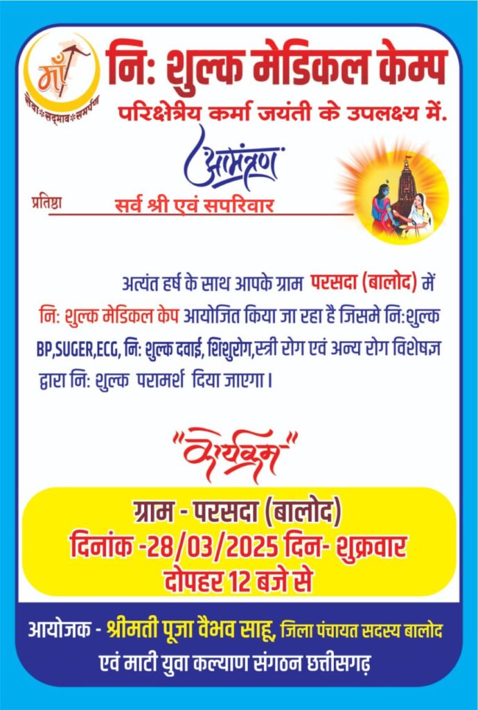 जहां पर लोगों का निशुल्क बीपी, शुगर जांच के साथ निशुल्क दवाई, नरसिंह अस्पताल बालोद के शिशु रोग, स्त्री रोग एवं अन्य रोग विशेषज्ञ द्वारा निशुल्क परामर्श दिया जाएगा। जिला पंचायत सदस्य पूजा साहू की मीडिया प्रभारी माधुरी यादव ने बताया कि उक्त कार्यक्रम की तैयारी हेतु विगत दिनों परसदा में बैठक भी रखी गई थी। जिसमें पहुंची जिला पंचायत सदस्य पूजा वैभव साहू व माटी युवा कल्याण संगठन के वैभव साहू ने समाज के समक्ष सुझाव रखा था कि कर्मा जयंती कार्यक्रम के तहत वे निशुल्क मेडिकल कैंप लगाकर जनहित का एक कार्य करना चाहते हैं। ताकि इसका लाभ समाज के सभी वर्गों को मिले। उक्त तैयारी बैठक में समाज ने उनके इस प्रस्ताव की सहमति दी थी। जिसके बाद परसदा में अब 28 मार्च को कर्मा जयंती के अवसर पर उक्त कैंप का आयोजन किया जा रहा है। इसके पहले भी माटी युवा कल्याण संगठन द्वारा क्षेत्र के विभिन्न गांव में निशुल्क मेडिकल कैंप लगाकर जरूरतमंदों की मदद की जा चुकी है।
