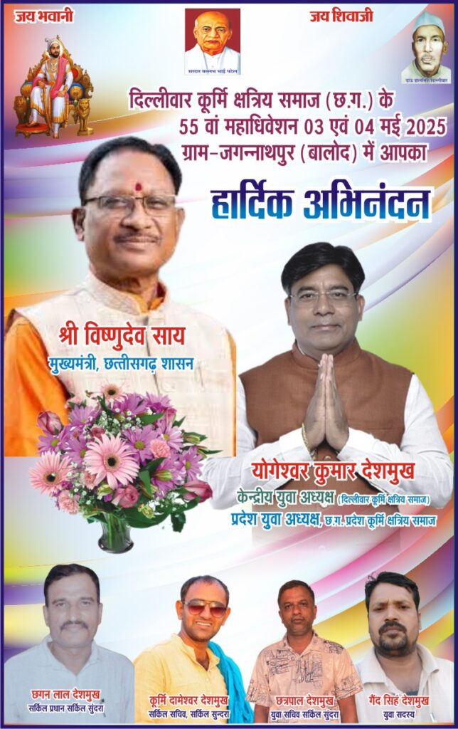 बालोद । बालोद जिले के ग्राम जगन्नाथपुर में दिल्लीवार कुर्मी क्षत्रिय समाज का 55वां अधिवेशन का कार्यक्रम 3 और 4 मई को होने जा रहा है। जिसमें 4 मई को मुख्य अतिथि के तौर पर मुख्यमंत्री विष्णु देव साय का आगमन प्रस्तावित है। इस संबंध में समाज प्रमुख ने मुख्यमंत्री से सौजन्य मुलाकात कर उन्हें इस कार्यक्रम के लिए आमंत्रित किया। इस पर उन्होंने सहमति जताई है । जिसके उपरांत गांव में उनके आगमन को लेकर हेलीपैड निर्माण भी शुरू हो चुका है । आमंत्रित करने के लिए भाजपा के जिला अध्यक्ष चेमन देशमुख, सर्व कुर्मी समाज के जिला अध्यक्ष सुरेंद्र देशमुख, सुंदरा सर्किल प्रधान छगनलाल देशमुख आदि पहुंचे हुए थे। समापन समारोह 4 मई के मुख्य अतिथि मुख्यमंत्री विष्णु देव साय होंगे। वहीं अध्यक्षता दिल्लीवार कुर्मी क्षत्रिय समाज छत्तीसगढ़ के अध्यक्ष डॉक्टर राजेंद्र हरमुख करेंगे। विशिष्ट अतिथि के रूप में लोकसभा क्षेत्र दुर्ग के सांसद विजय बघेल, बालोद विधायक संगीता सिन्हा, भाजपा जिला अध्यक्ष चेमन देशमुख, जिला पंचायत बालोद के अध्यक्ष तारिणी पुष्पेंद्र चंद्राकर, श्री तुलसी मानस प्रतिष्ठान छत्तीसगढ़ के प्रदेश अध्यक्ष जगदीश देशमुख होंगे। इसी तरह शुभारंभ पर 3 मई के मुख्य अतिथि विधायक कुंवर सिंह निषाद होंगे। अध्यक्षता प्रदेश अध्यक्ष डॉ राजेंद्र हरमुख करेंगे। विशिष्ट अतिथि के रूप में मिथिलेश देशमुख, जिला पंचायत सदस्य पूजा साहू, जनपद सदस्य दमयंती हरदेल,जगन्नाथपुर सरपंच देव कुंवर कोसमा, भोलाराम देशमुख, सर्व कुर्मी समाज बालोद अध्यक्ष सुरेंद्र देशमुख होंगे।