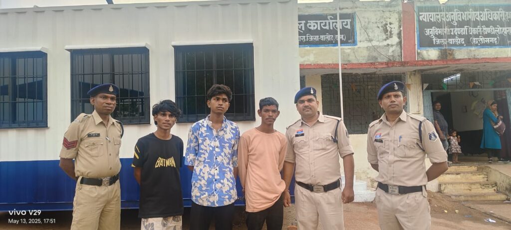 आरोपीगण (01) लक्ष्य ठाकुर उर्फ लक्की पिता हृदय ठाकुर, उम्र 19 वर्ष 07 माह, निवासी वार्ड क्र. 46 शिव बजरंग मंदिर क्लब चौक गली नं. 06 बसंतपुर राजनांदगांव, थाना बसंतपुर जिला राजनांदगांव (02) दीपक कुमार यादव पिता हेमंत यादव उम्र 21 वर्ष, निवासी वार्ड क्र. 46 क्लब चौक हनुमान मंदिर के पास बसंतपुर राजनांदगांव, थाना बसंतपुर जिला राजनांदगांव (03) अभय राजपूत उर्फ लक्की पिता अजय राजपूत उम्र 18 वर्ष, निवासी वार्ड क्र. 46 क्लब चौक हनुमान मंदिर के पास बसंतपुर राजनांदगांव, थाना बसंतपुर जिला राजनांदगांव एवं अन्य 05 विधि से संघर्षरत बालक (नाबालिग) शामिल हैं। जिनके कब्जे से घटना में उपयोग किये स्टील की चाकू एवं लोहे का कड़ा बरामद कर आरोपियों को गिरफ्तार कर न्यायिक रिमाण्ड पर न्यायालय पेश किया गया।
