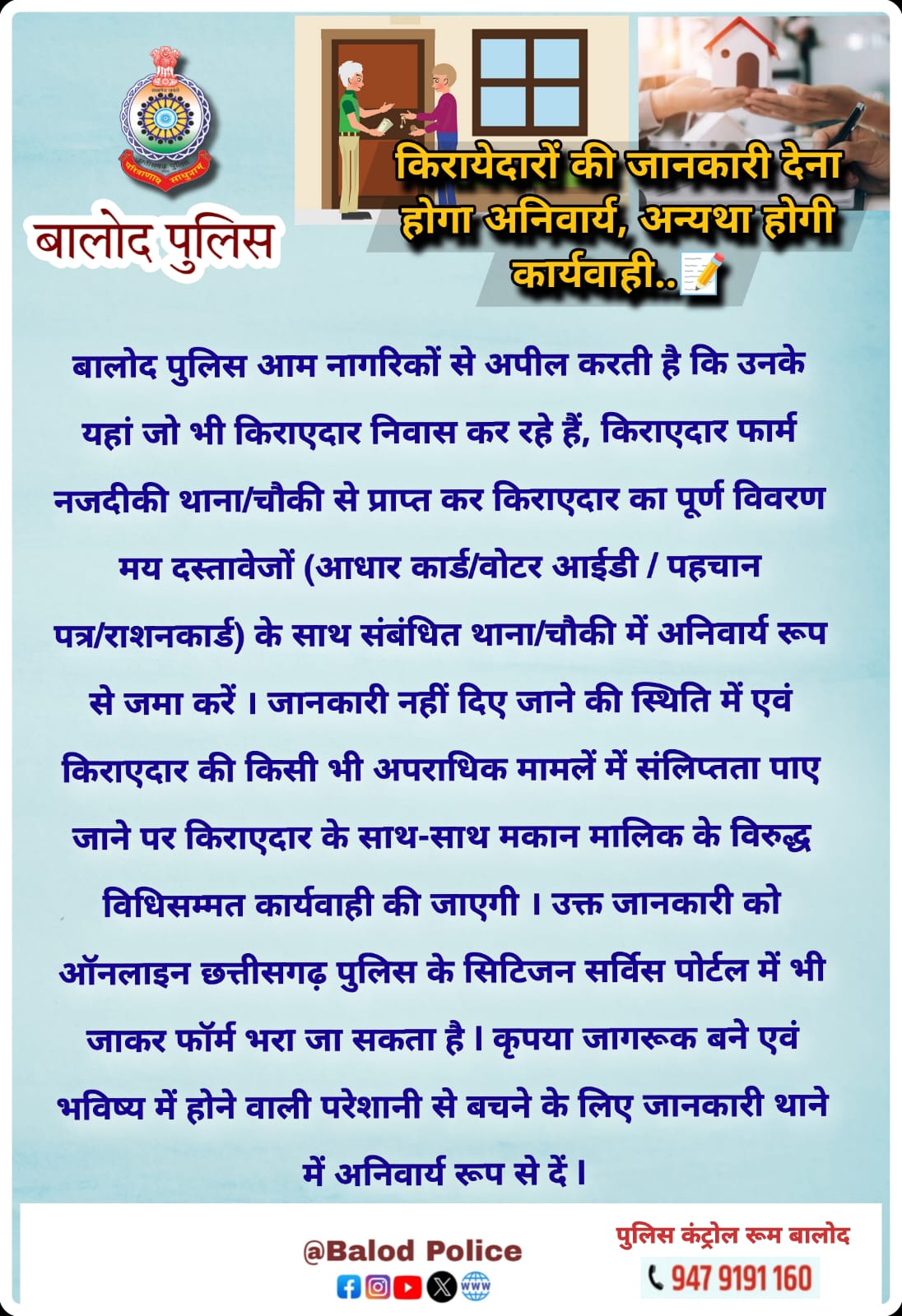 बालोद। बालोद पुलिस आम नागरिकों से अपील की गई है कि उनके यहां जो भी किराएदार निवास कर रहे हैं, किराएदार फार्म नजदीकी थाना/चौकी से प्राप्त कर किराएदार का पूर्ण विवरण मय दस्तावेजों (आधार कार्ड/वोटर आईडी / पहचान पत्र/राशनकार्ड) के साथ संबंधित थाना/चौकी में अनिवार्य रूप से जमा करें। जानकारी नहीं दिए जाने की स्थिति में एवं किराएदार की किसी भी मामलें में संलिप्तता पाए जाने पर किराएदार के साथ-साथ मकान मालिक के विरुद्ध विधिसम्मत कार्रवाई की जाएगी। उक्त जानकारी छत्तीसगढ़ पुलिस के पोर्टल – सिटिजन सर्विस पोर्टल में जाकर ऑनलाइन भी फॉर्म भरा जा सकता है। एसपी योगेश पटेल ने कहा है कि कृपया जागरूक बने एवं भविष्य में होने वाली परेशानी से बचने के लिए जानकारी थाने में अनिवार्य रूप से दें।