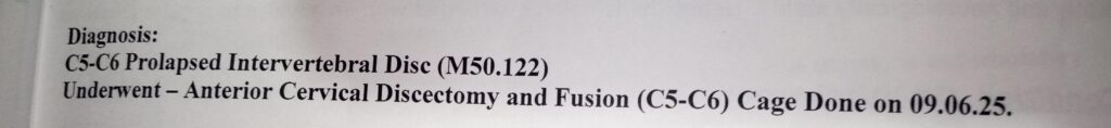 इंटीरियर सर्वाइकल डिस्कटॉमी और फ्यूजन सर्जरी हुई है